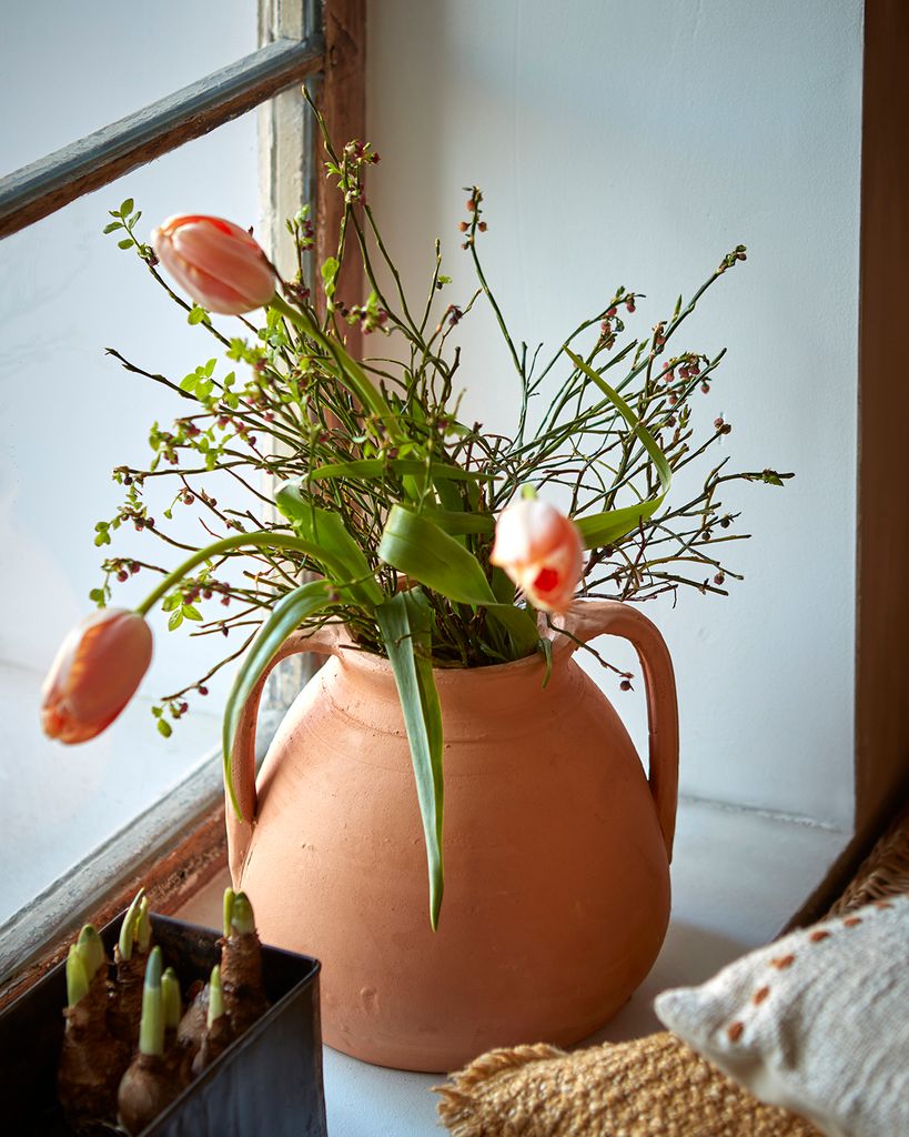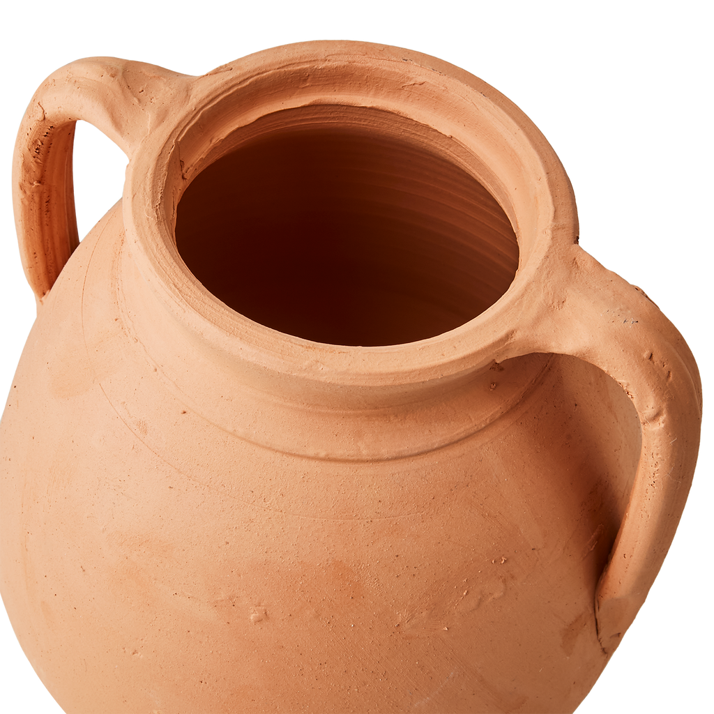 Handgjord terrakottaurna med rustik charm, perfekt för dekorativa arrangemang inomhus.