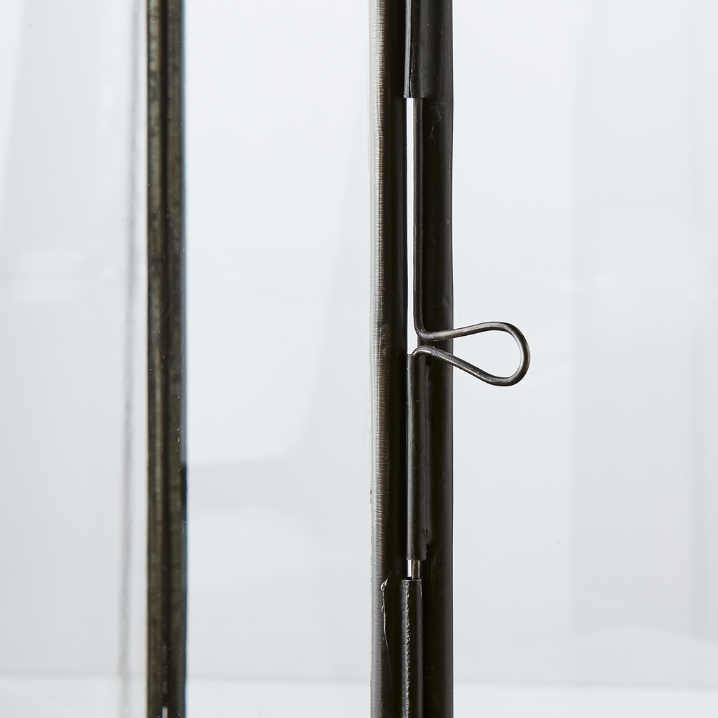 Lyktans mått är 18 cm i längd och bredd samt 44/53 cm i höjd, vilket gör den idealisk för placering på golvet eller ett bord. Den perforerade metalltoppen ger ett dekorativt ljusspel när lyktan är tänd, vilket framhäver dess charmiga design. Observera att lyktan fortsätter att patineras om den utsätts för fukt, vilket ger den en unik karaktär över tid.