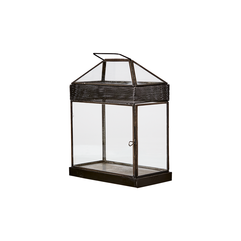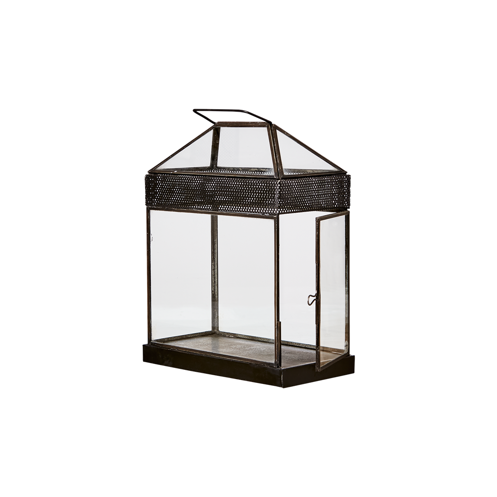 Den genomtänkta designen med perforerat järn upptill ger ett vackert ljusmönster när lyktan är tänd. Glasväggarna omger ljuset och skyddar det från vind, vilket gör den perfekt för både inomhus- och utomhusbruk.
