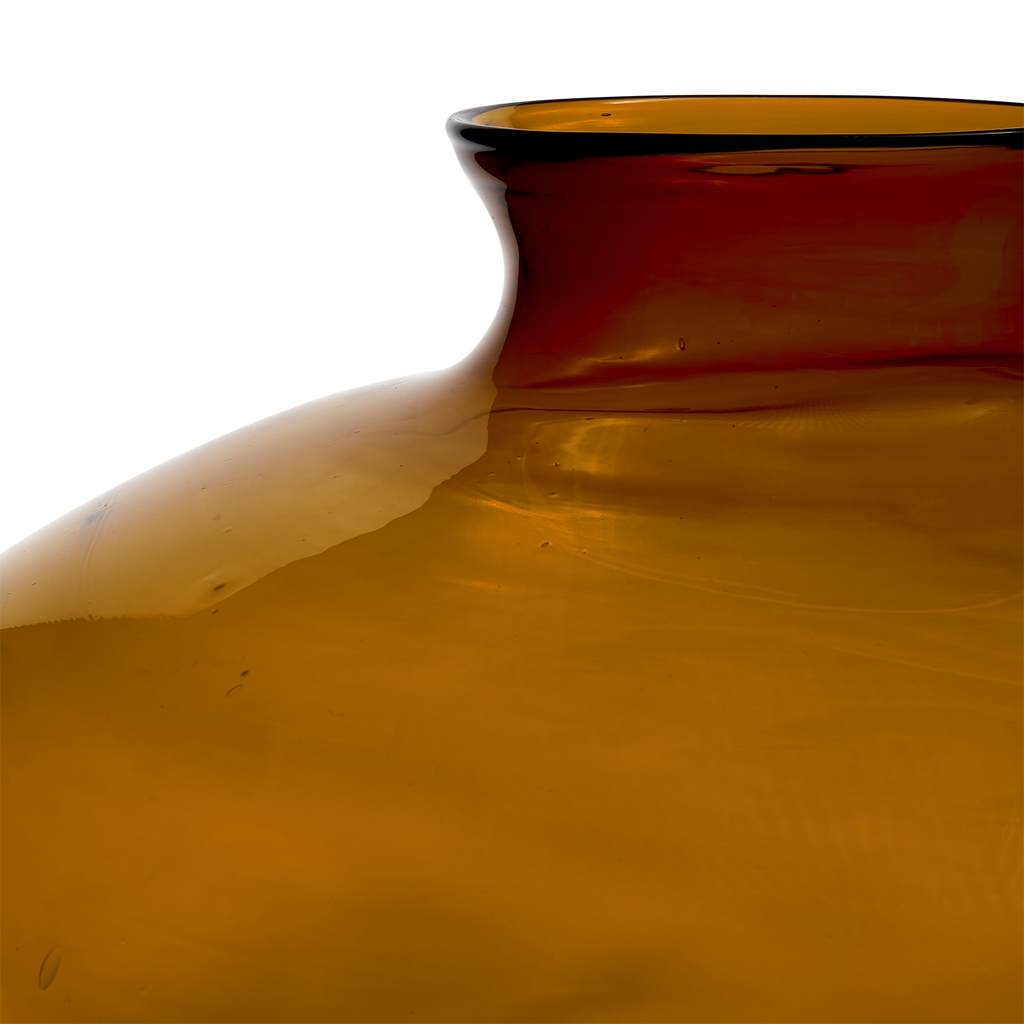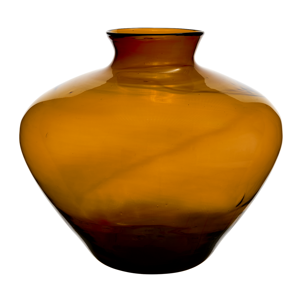 Varje vas är munblåst, vilket ger den en unik prägel med charmiga bubblor och ojämnheter. Den djupa bruna färgen ger en varm och inbjudande känsla, idealisk för att framhäva dina favoritblommor eller stå som ett konstverk i sig själv.
