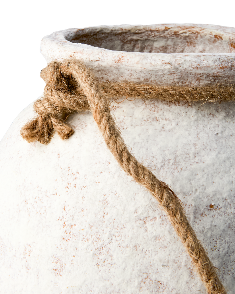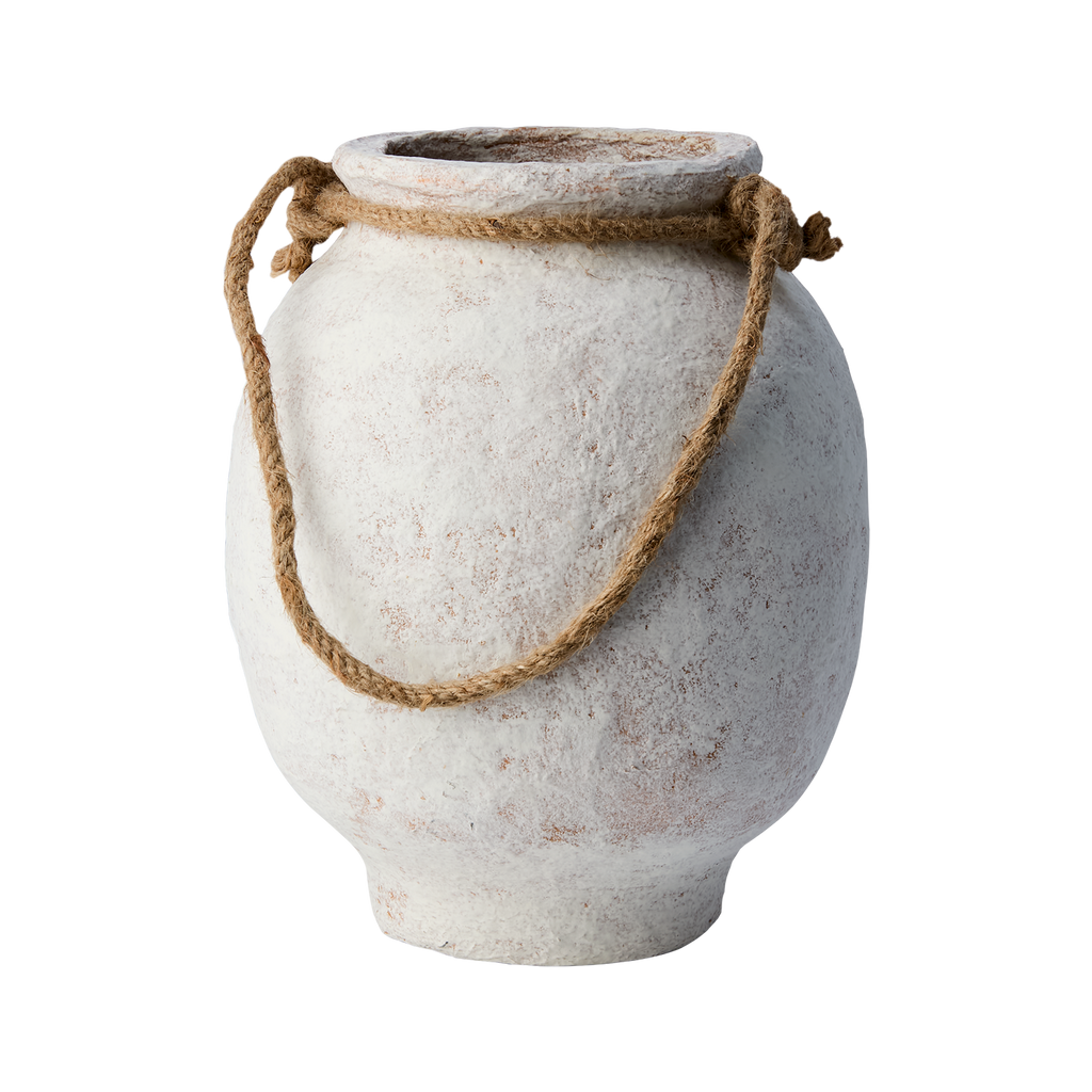 Med en diameter på 25 cm och en höjd på 30 cm, rymmer denna vas enkelt större blommor eller dekorativa grenar. Den är dessutom vattentät, vilket gör den praktisk för daglig användning. Den naturliga jutesnöret som löper runt vasen tillför en extra touch av rustik charm, vilket gör den idealisk för att skapa en inbjudande och varm atmosfär.