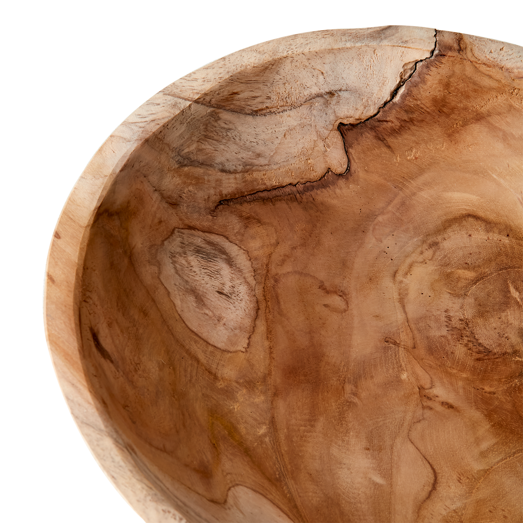 Skål. Sprickor och ojämnheter är en naturlig del av produkten. Teakrot innehåller naturlig olja, kan ge märken på ömtåliga ytor.