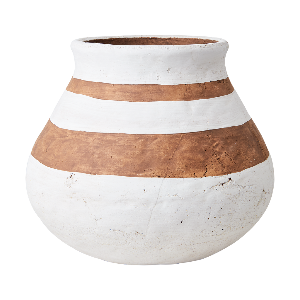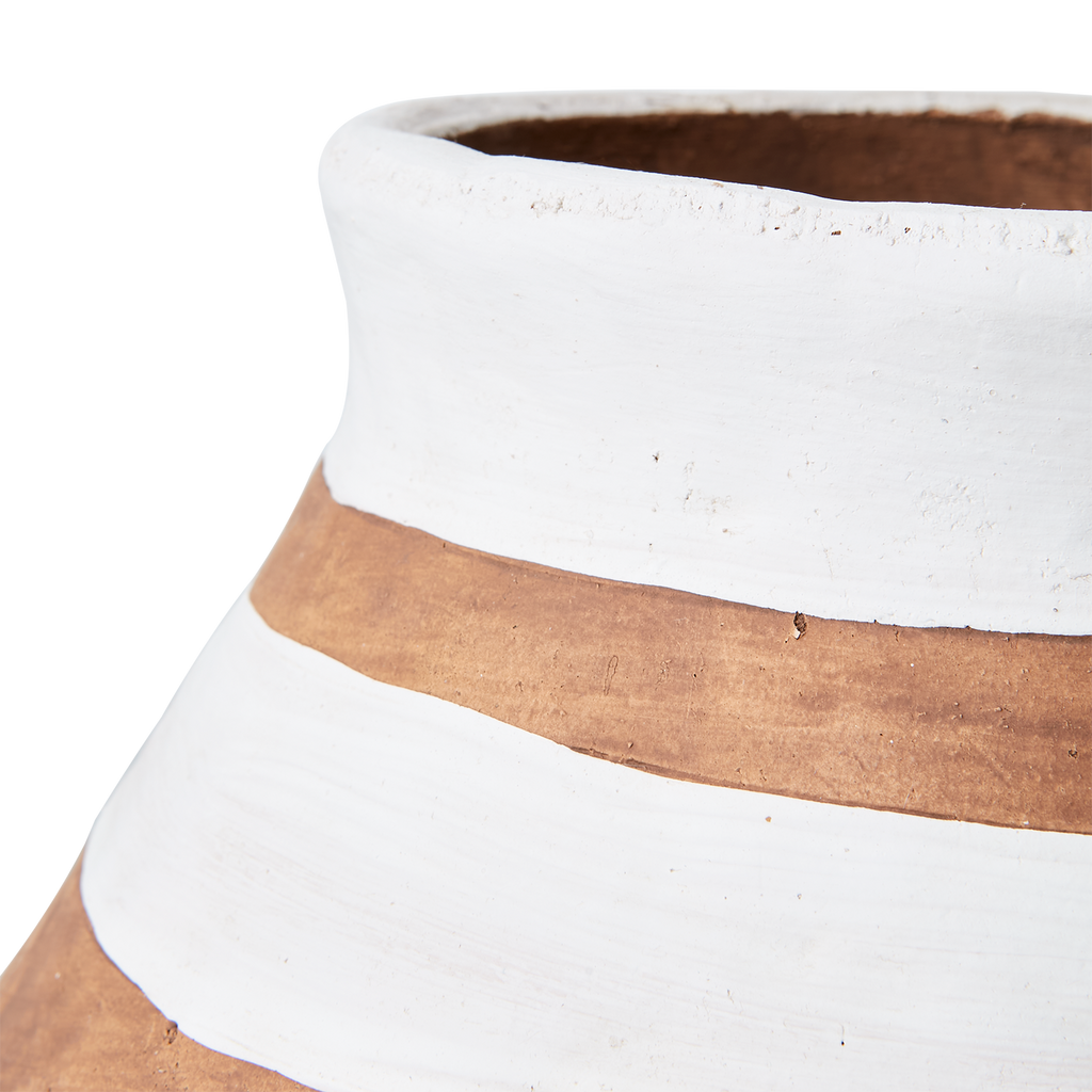 Elegant terrakottakruka med vit och brun design, perfekt för både inomhus och utomhus miljöer.