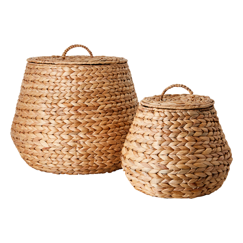 Detta set inkluderar två korgar i olika storlekar: Ø22/30xH30 cm och Ø34/40xH42 cm. Varje korg har ett praktiskt lock med en flätad ögla för enkel hantering och för att hålla dina ägodelar säkra och undan från damm.