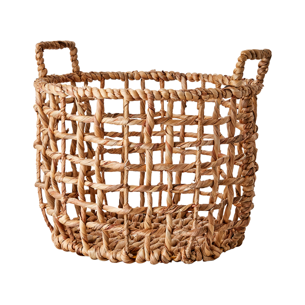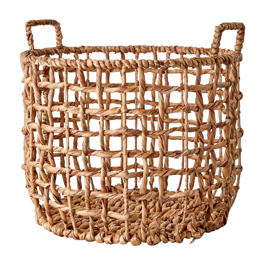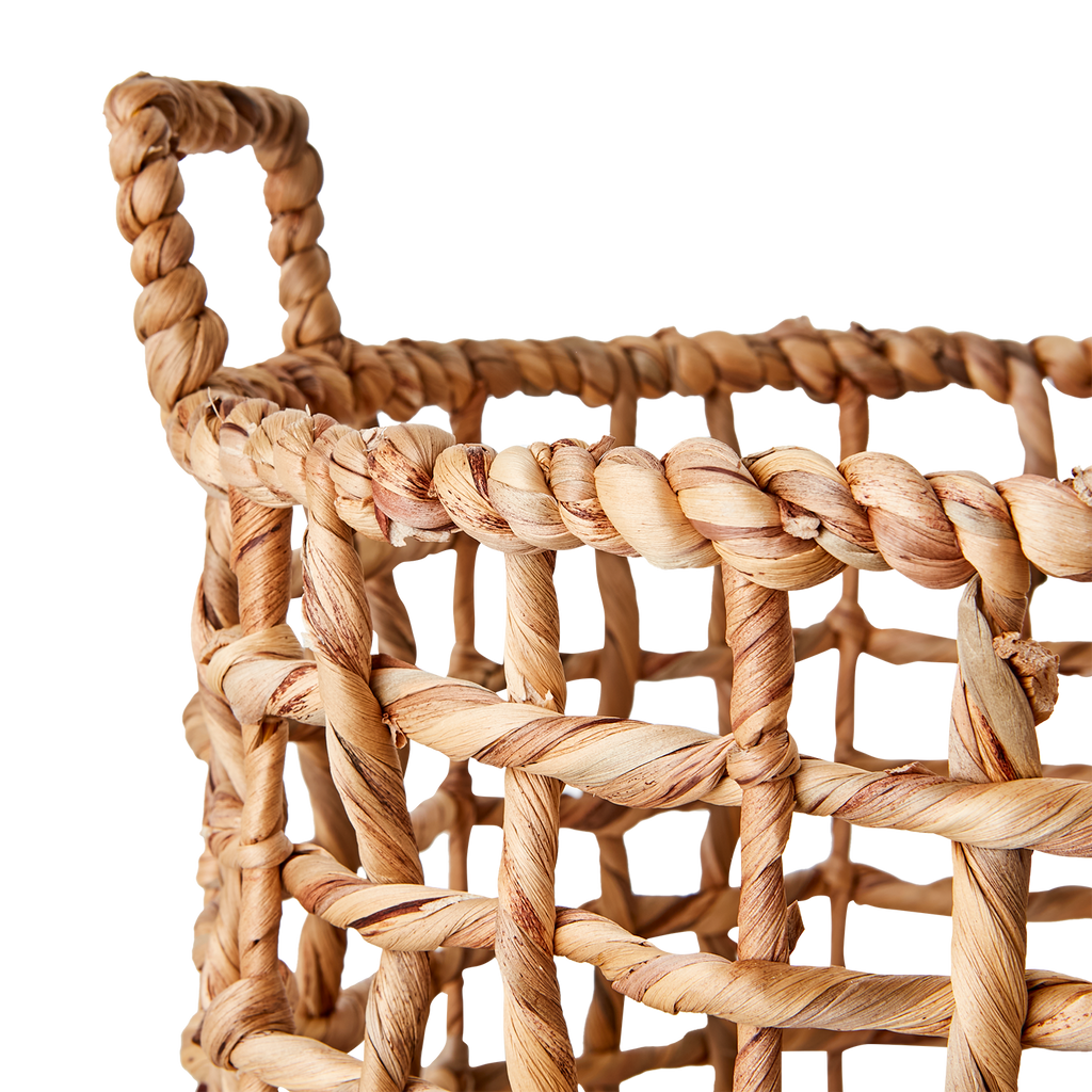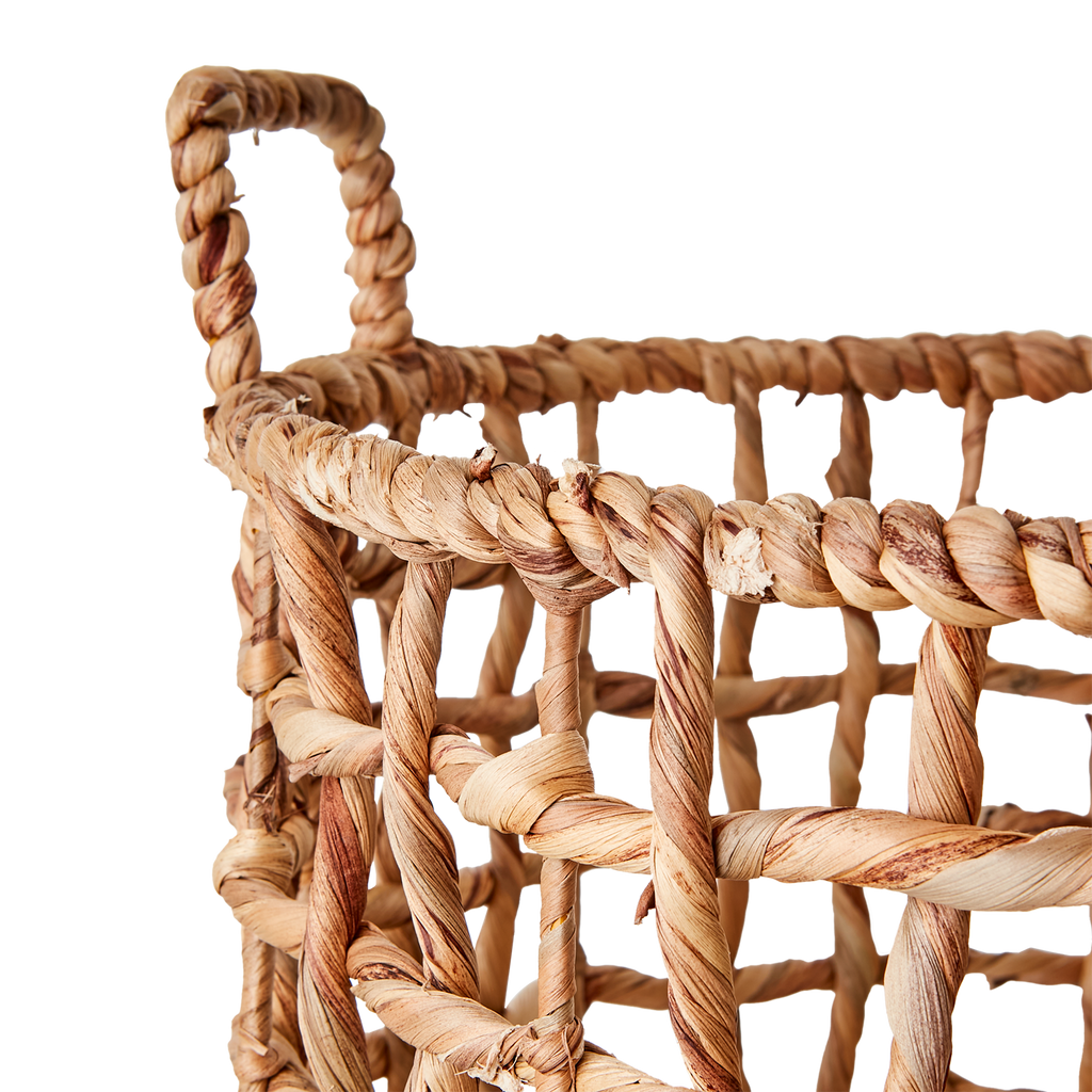 Designen är öppen och luftig med stora flätade hål, vilket ger en lätt och organisk känsla. Korgarna har stabila handtag som underlättar förflyttning, vilket gör dem praktiska för vardagsbruk. Med en totalvikt på 3,32 kg är de robusta och hållbara.