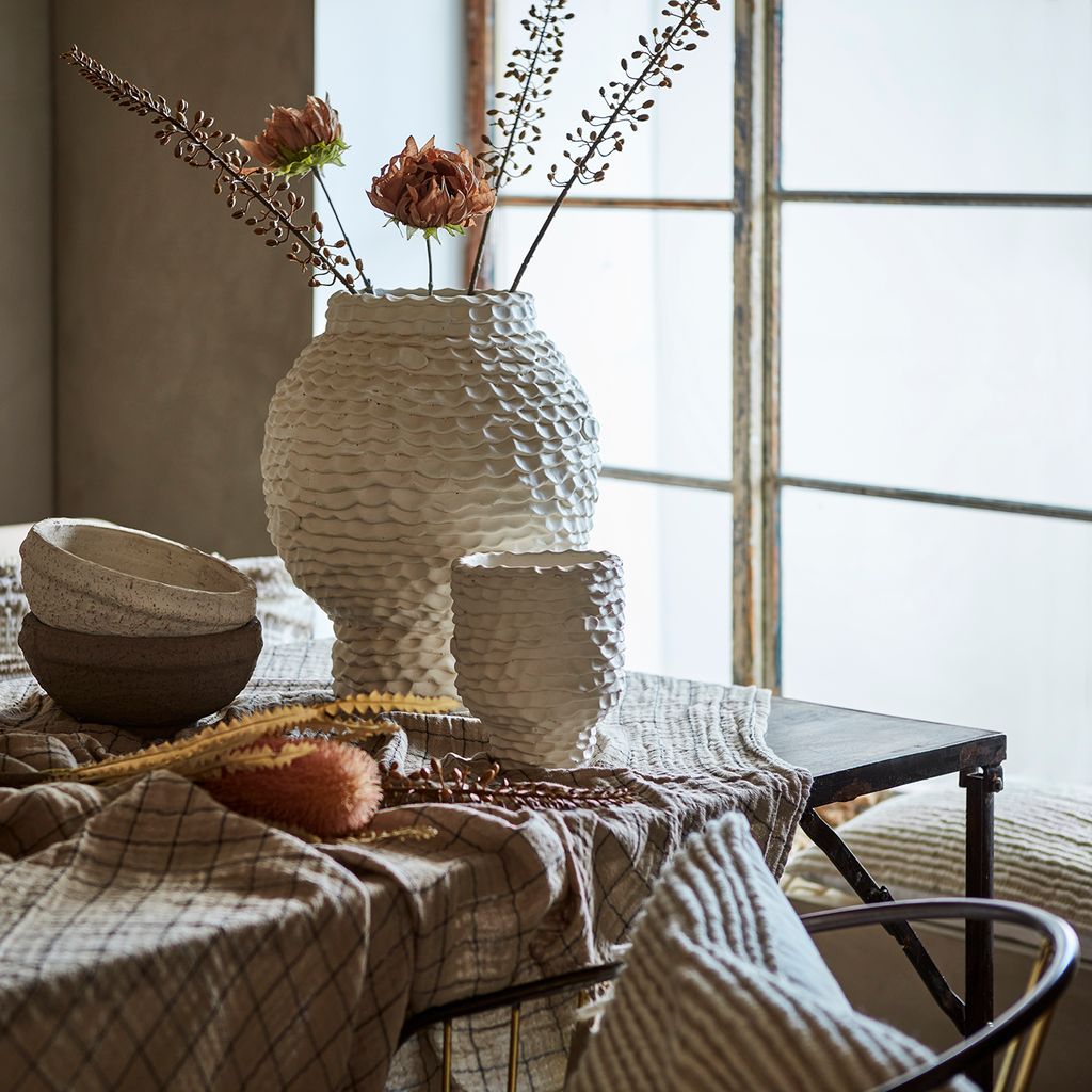 Affari of Sweden's CREAM Kruka L i elfenben erbjuder en kombination av stil och hållbarhet. Tillverkad av robust betong, har denna kruka en unik vågig yta som ger en distinkt och modern känsla. Med en diameter på 31 cm och höjd på 42 cm, är den idealisk för både större växter och som en dekorativ pjäs i sig själv.