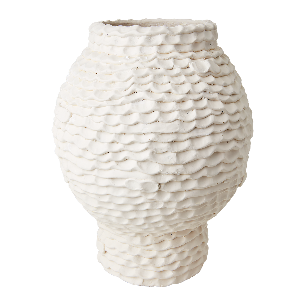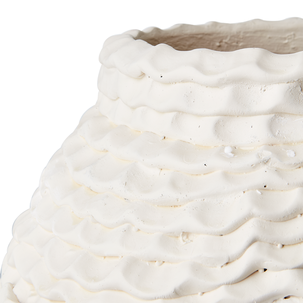 Elegant kruka i elfenbensfärgad betong med unik vågig textur, perfekt för både inomhus- och utomhusbruk.
