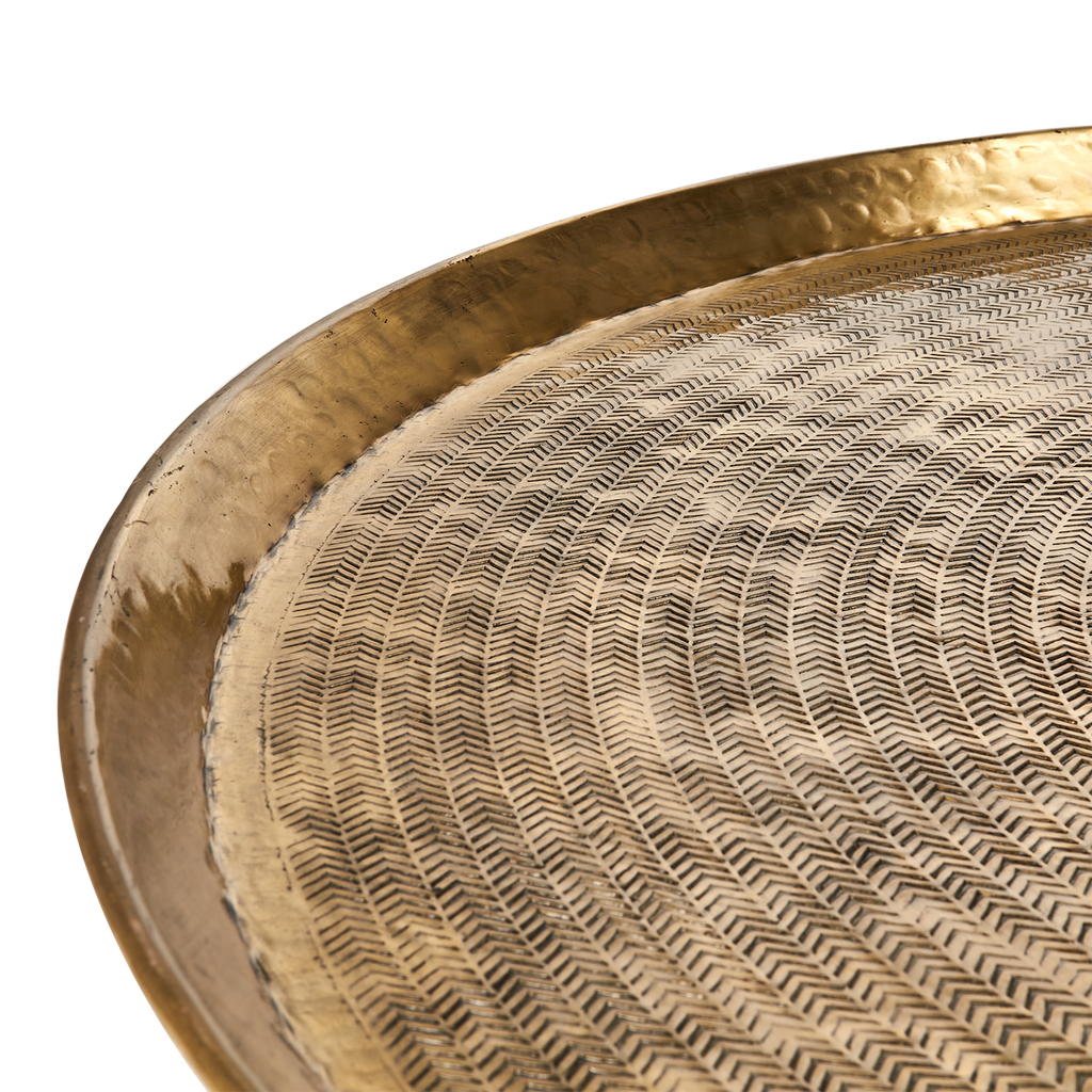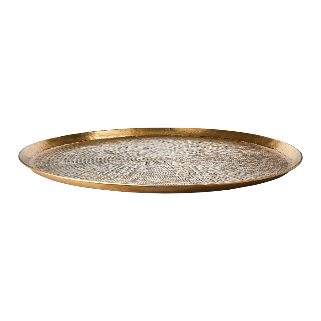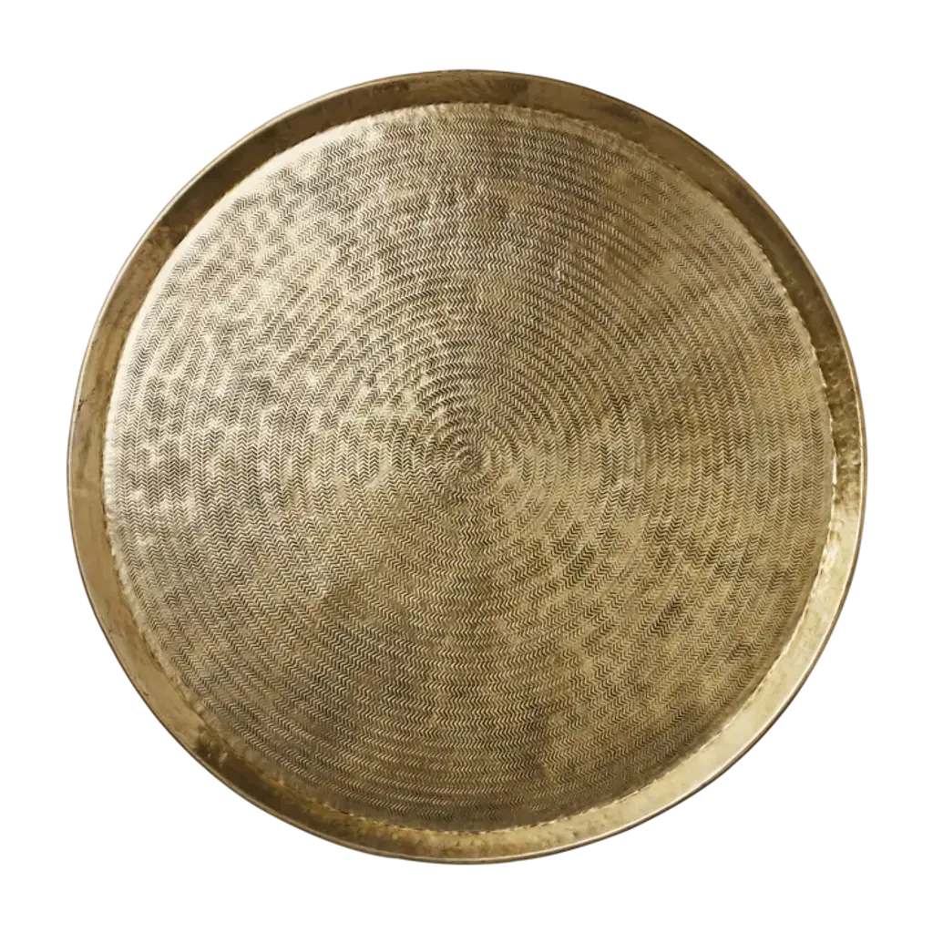 Elegant mässingsfärgat fat i aluminium med unik textur, perfekt för både dekoration och servering.