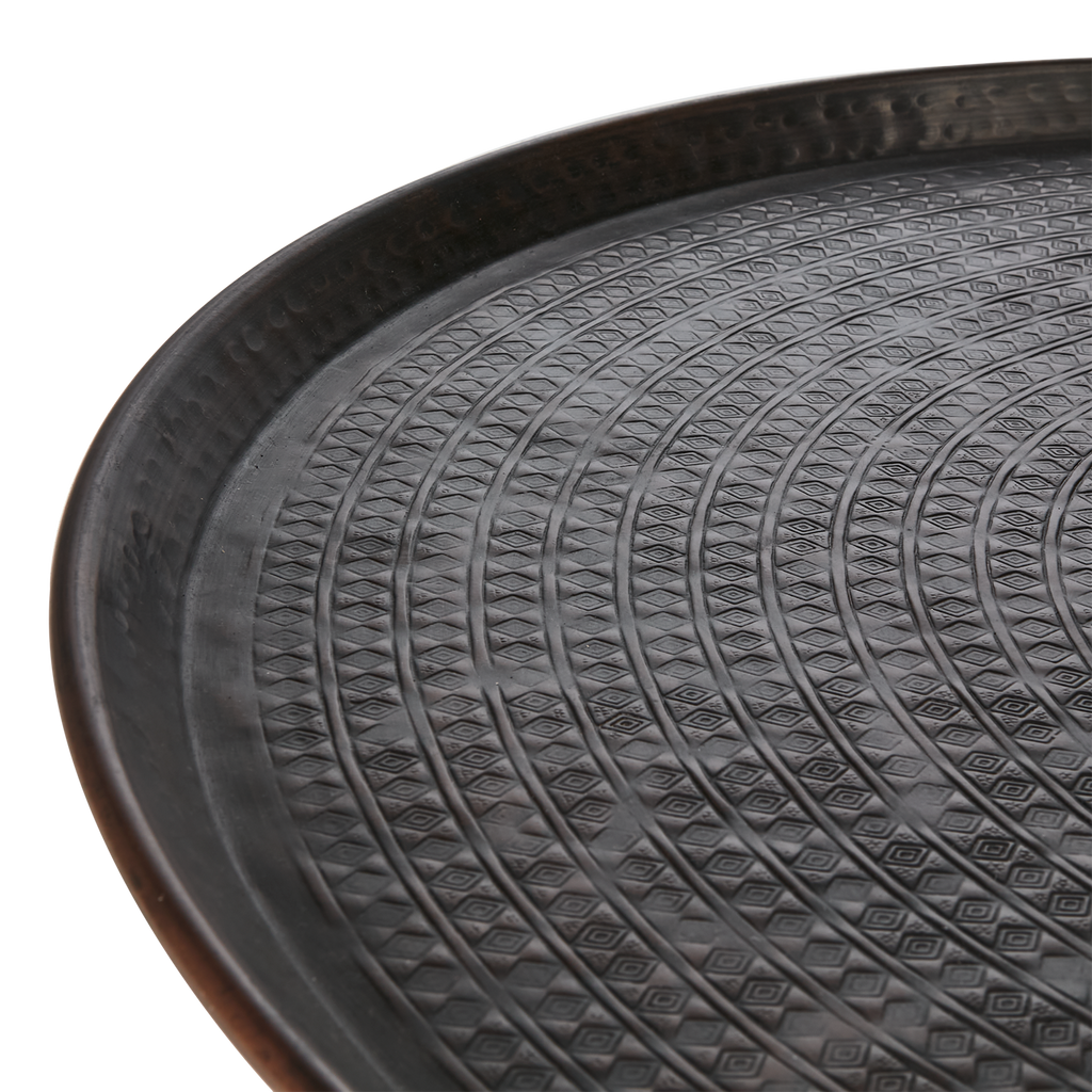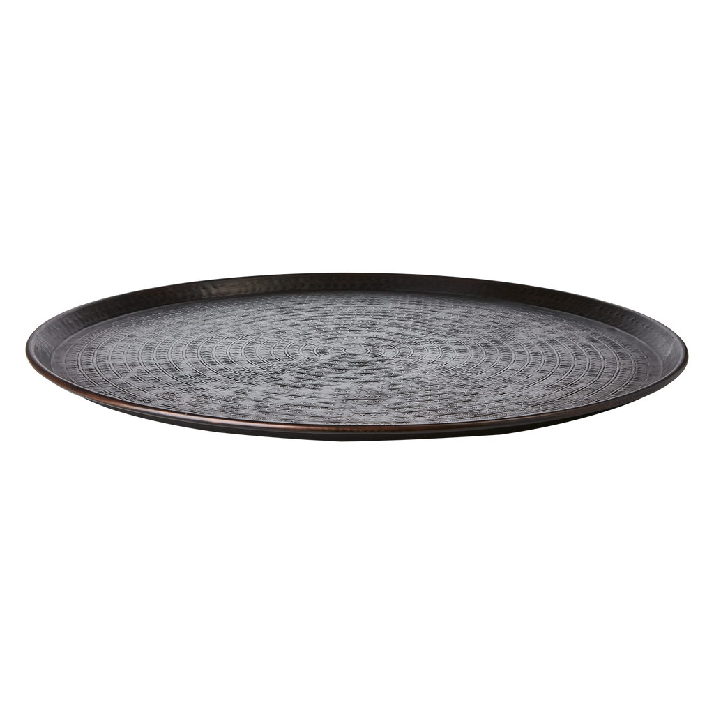 Elegant fat i brun/svart aluminium med unik textur, perfekt för servering och dekoration.