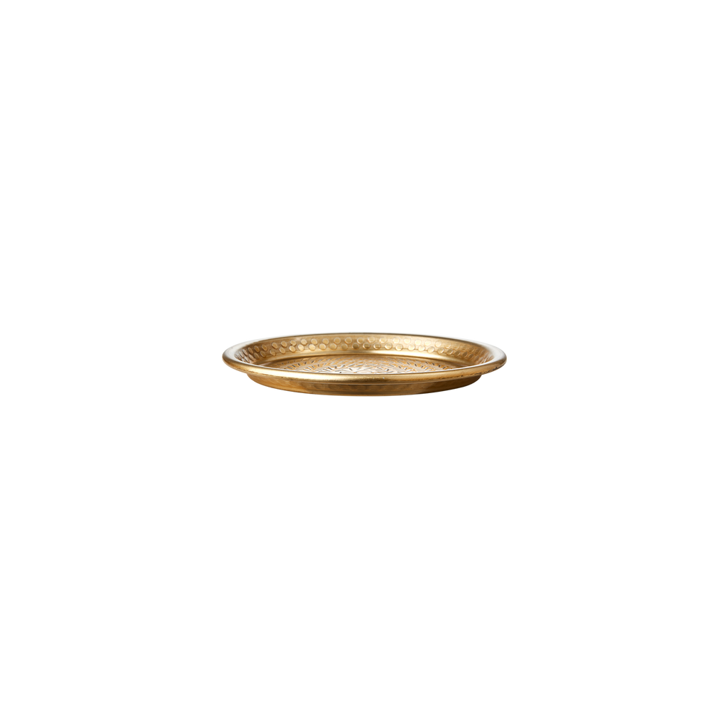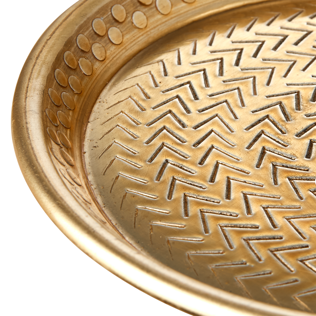 Elegant mässingsfärgat fat i aluminium med detaljerad mönstring, perfekt för stilfull servering.