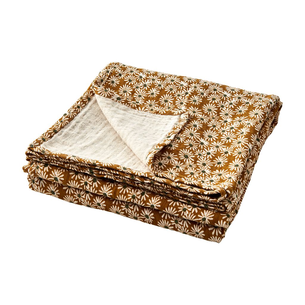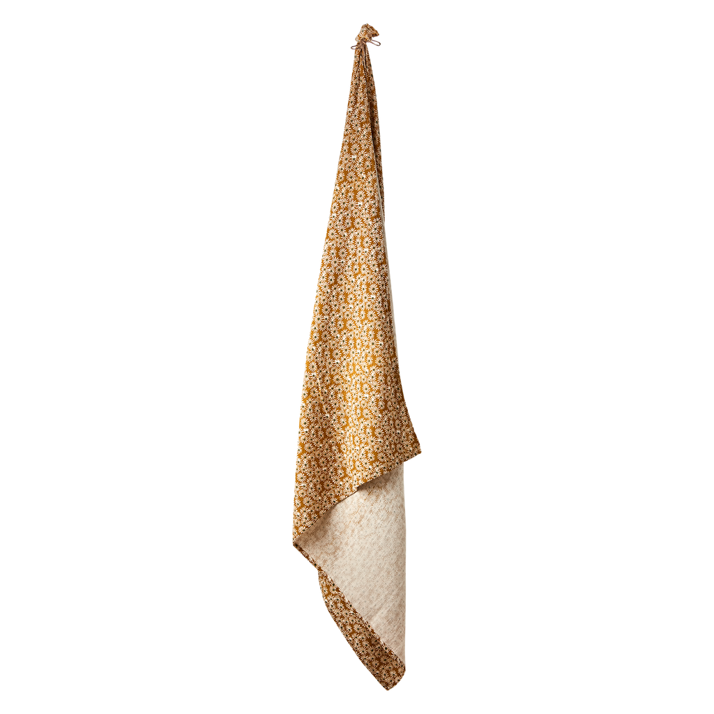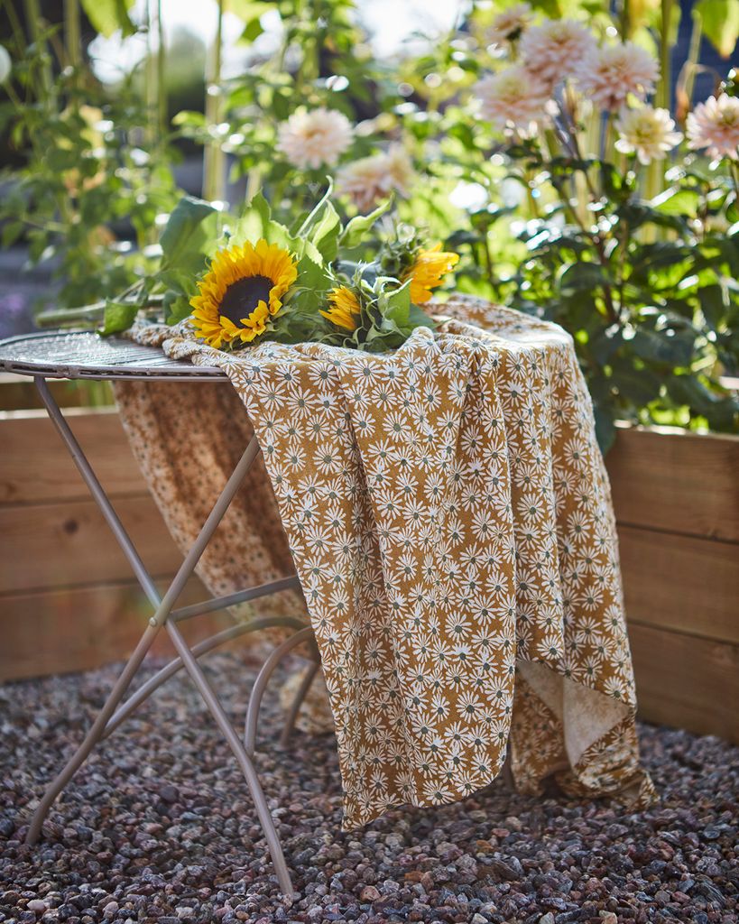 Elegant bordsduk i bomull med blommönster i senapsgul, elfenben och grönt. Perfekt för att ge bordet en stilfull touch.