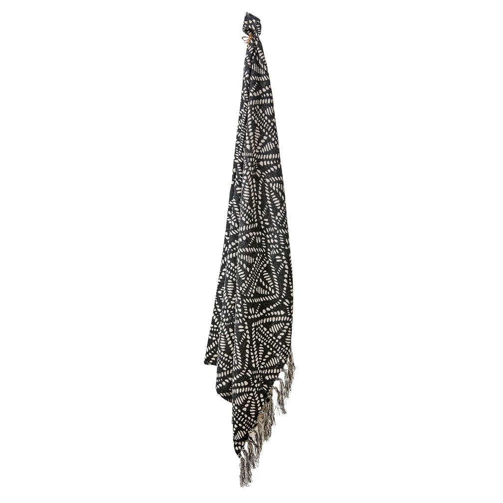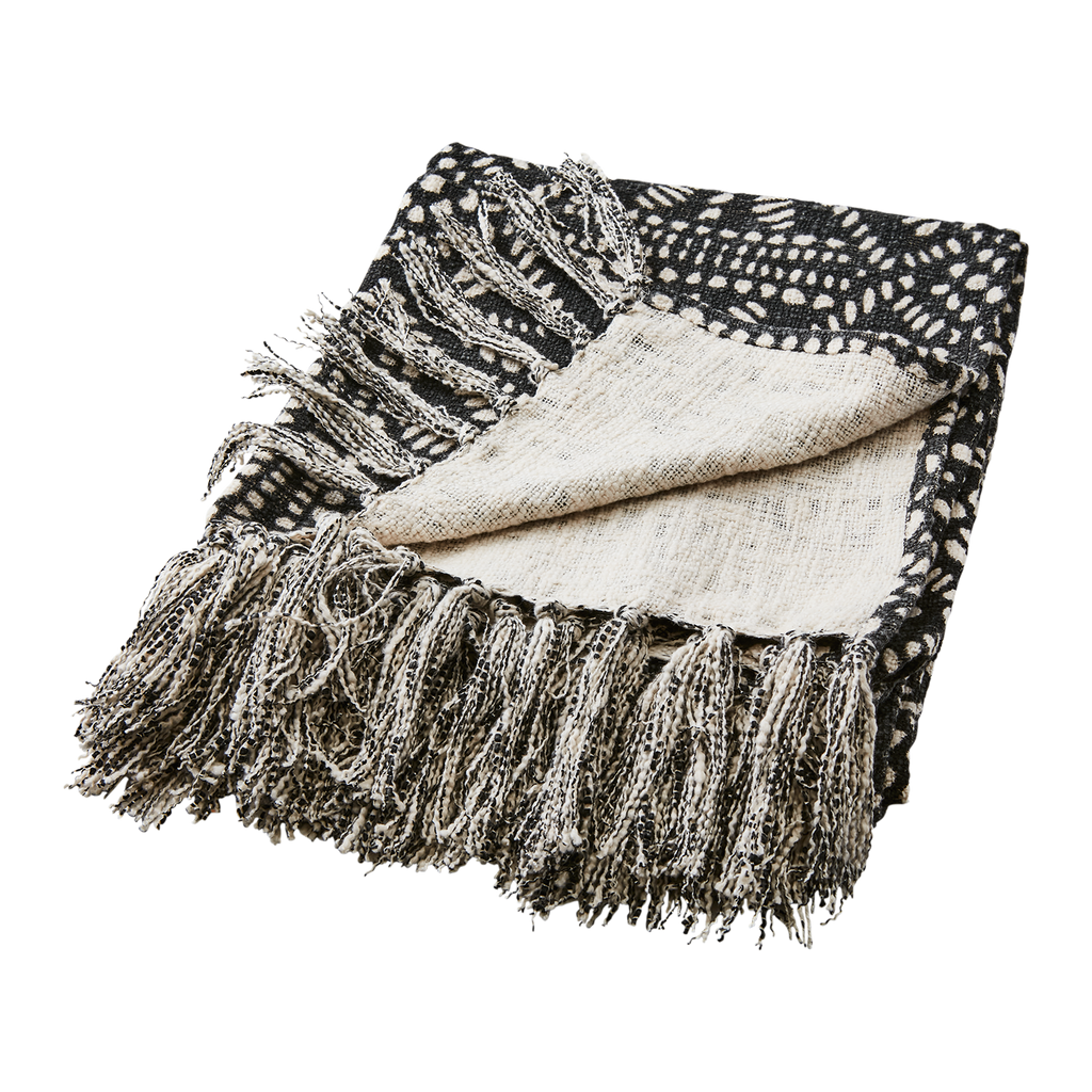 Elegant bomullsfilt i natur/svart med intrikat mönster och dekorativa fransar. Perfekt för alla rum.