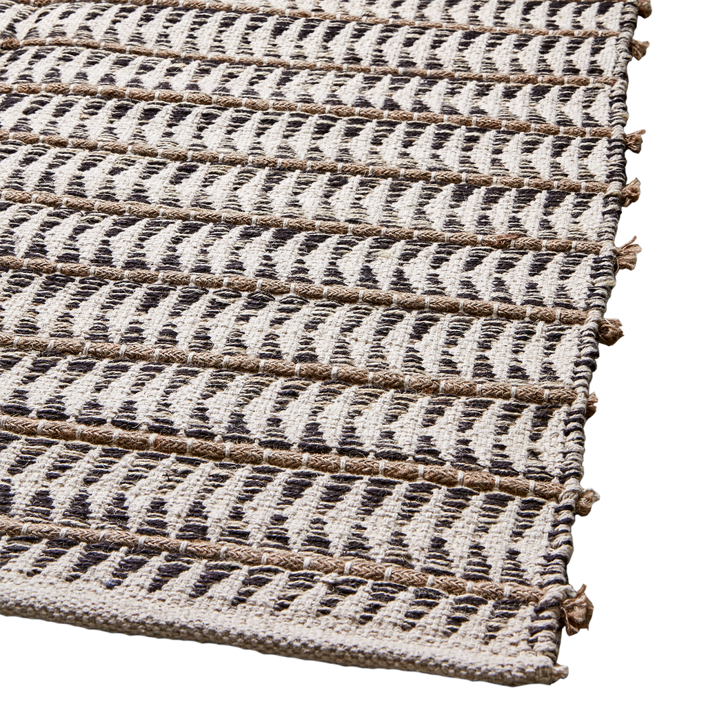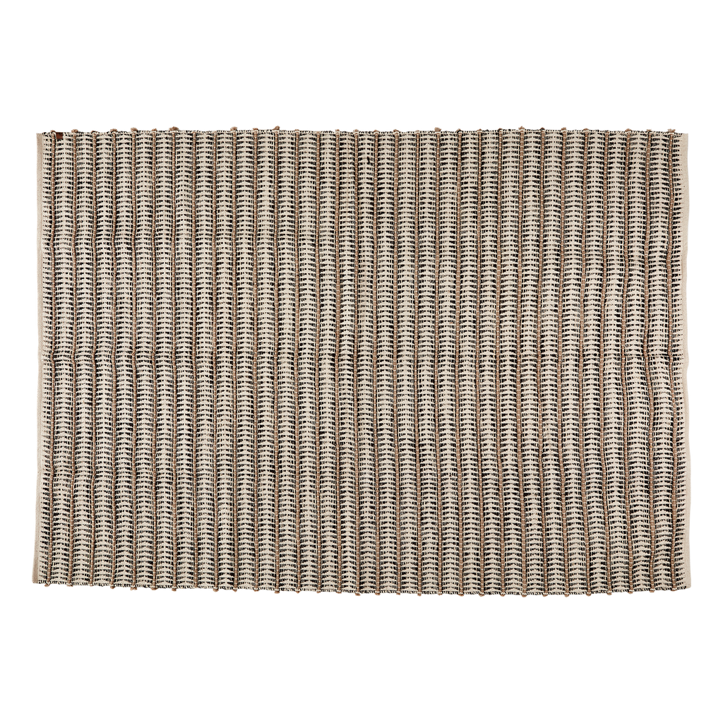 Mattan är tillverkad i en blandning av bomull och jute, vilket ger den både hållbarhet och en härligt strukturerad yta. Den naturliga vävtekniken framhäver hantverkskänslan och skapar en varm, inbjudande atmosfär i hemmet.