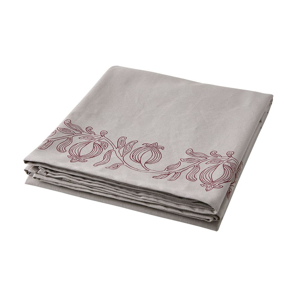 Elegant bordsduk i natur och burgundy med vackert mönster, tillverkad av bomull. Perfekt för stilfulla dukningar.