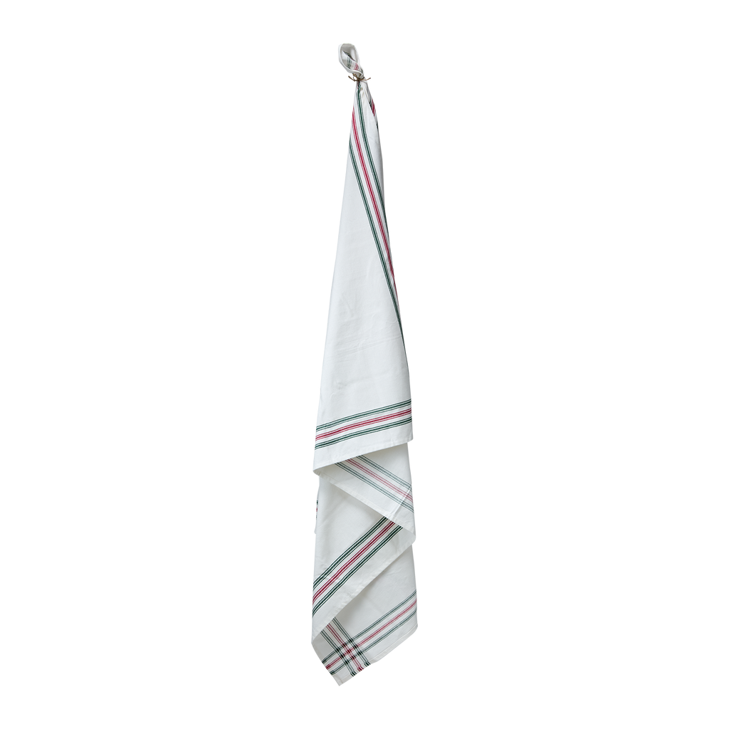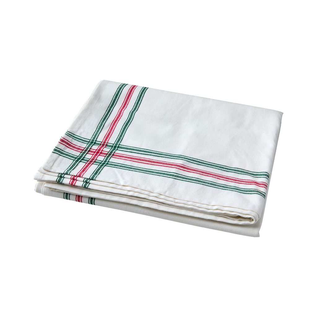 Randig bomullsduk, perfekt för både vardag och fest, med vacker inramning i grönt och rött.
