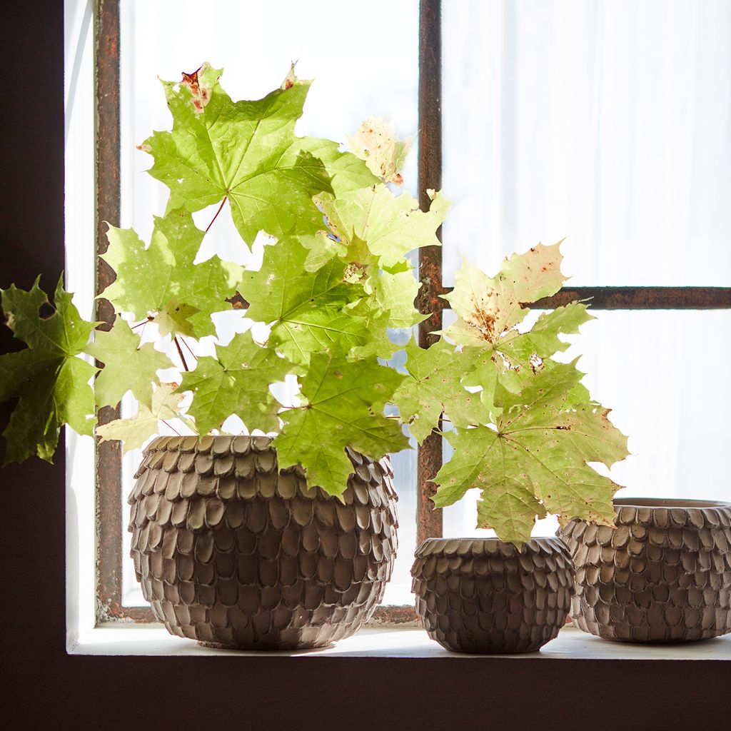 Krukan kännetecknas av sin unika fjälliknande textur, vilket tillför en konstnärlig och naturlig känsla till alla rum. Den noggrant handgjorda ytan ger varje kruka ett unikt utseende, vilket gör den till ett konstverk i sig. Dessutom har den ett innermått på Ø22 cm vilket erbjuder gott om utrymme för dina växters rötter att växa.