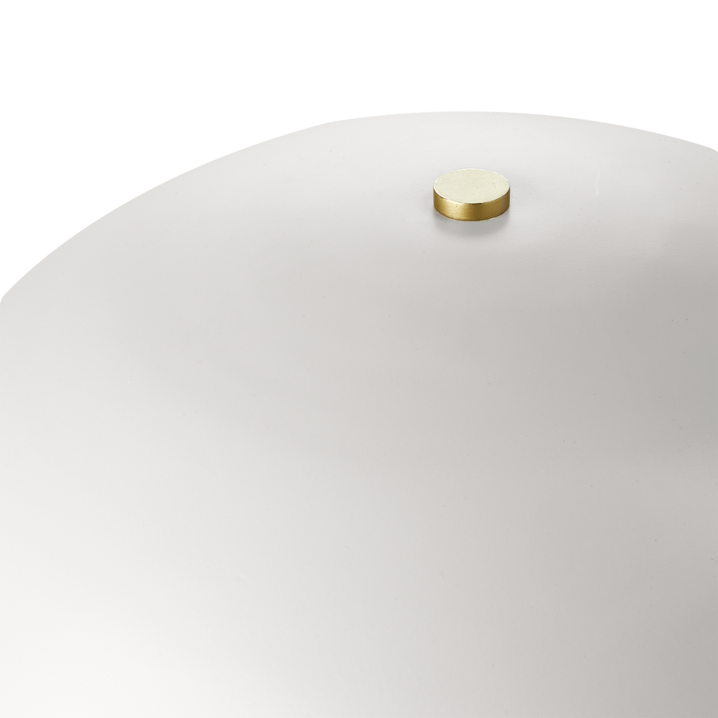Lampans topp är försedd med en dekorativ messingdetalj, vilket ger en subtil touch av lyx. Den vita ytan reflekterar ljuset på ett mjukt och behagligt sätt, vilket skapar en varm atmosfär.