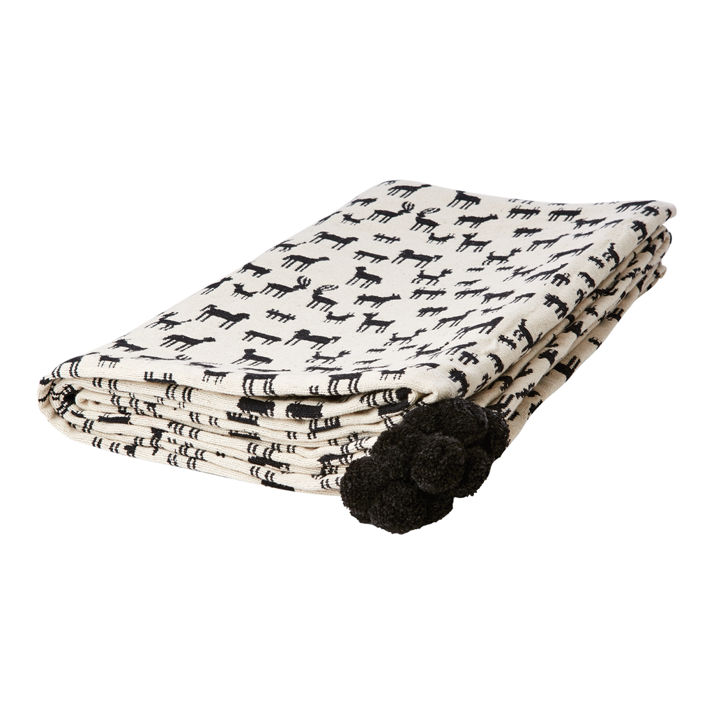 Det unika grafiska mönstret i svart på den benvita bakgrunden ger en modern touch till varje rum. De dekorativa tofsarna i hörnen adderar en extra dimension av elegans. För bästa hållbarhet, rekommenderar vi endast fläckbehandling av denna produkt.
