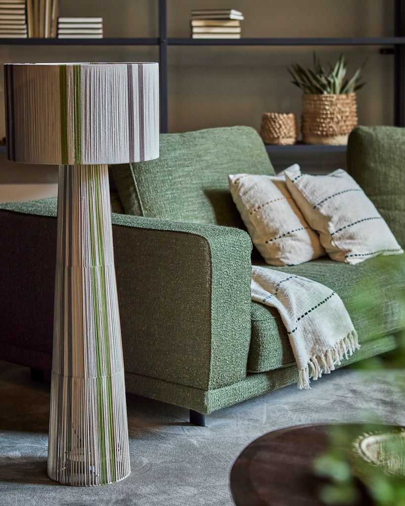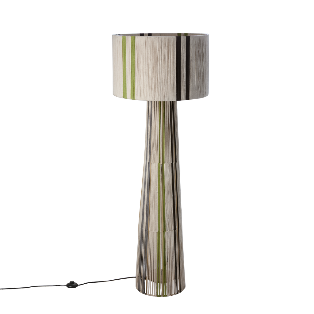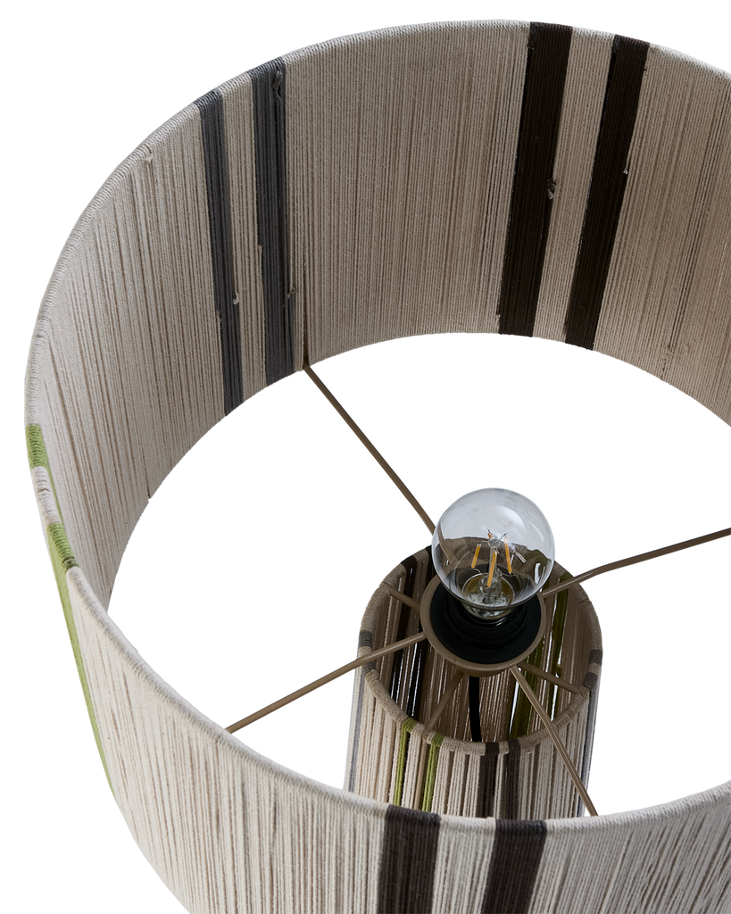 Charmig golvlampa med flerfärgad design av jute och järn, perfekt för stilfull belysning.
