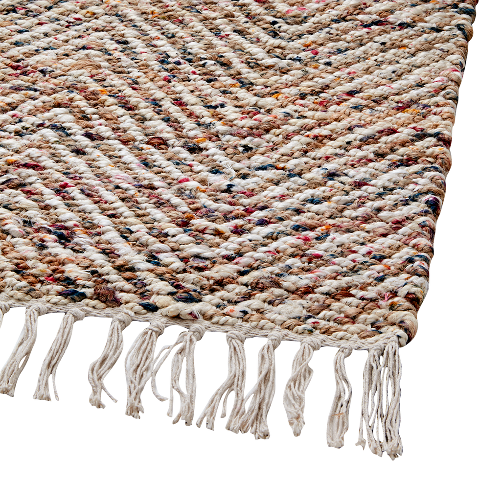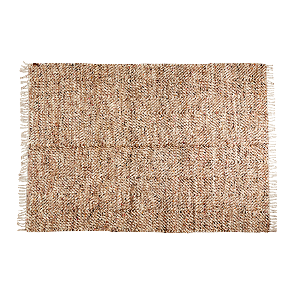 Med sitt zigzag-mönster och de naturliga färgtonerna av beige, brunt och subtila flerfärgade inslag, ger denna matta en varm och inbjudande känsla till vilket rum som helst. Dess fransar på kortsidorna tillför en charmig detalj och kompletterar dess tidlösa design.