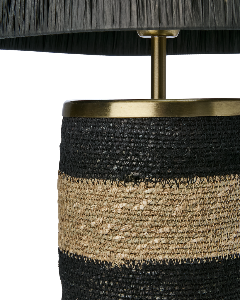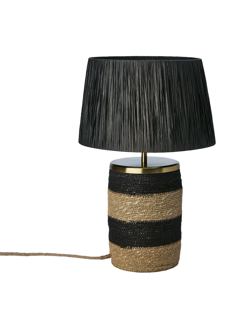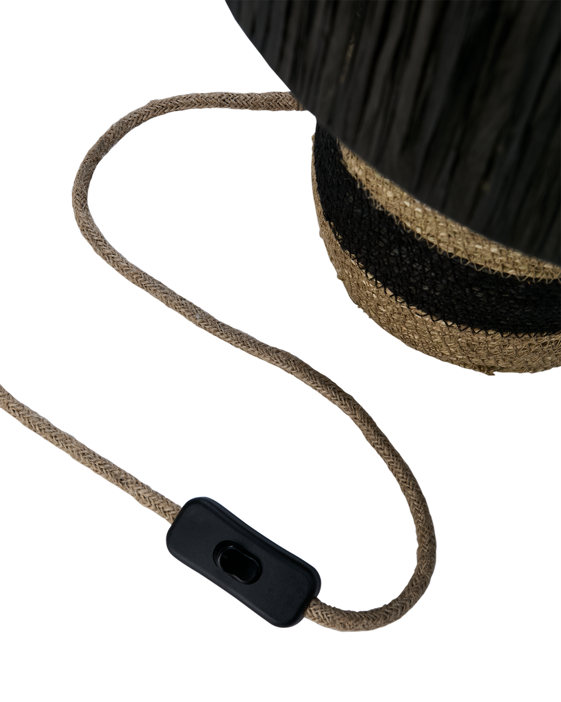 Landos stilrena design kombinerar nordisk enkelhet med naturliga material för att skapa en unik bordslampa. Skärmen är tillverkad av svart raffiagräs som ger en elegant och luftig känsla, medan basen har ett randigt mönster av svart och naturligt moonjgräs. Detta bidrar till en intressant textur och visuell kontrast.