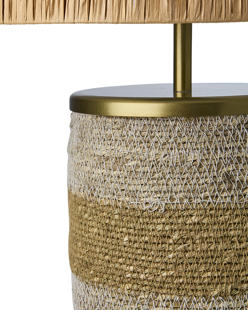 Elegant bordslampa i vit och naturlig design med hållbara material som moonjgräs och raffiagräs. Perfekt för ett stilrent inredningsuttryck.