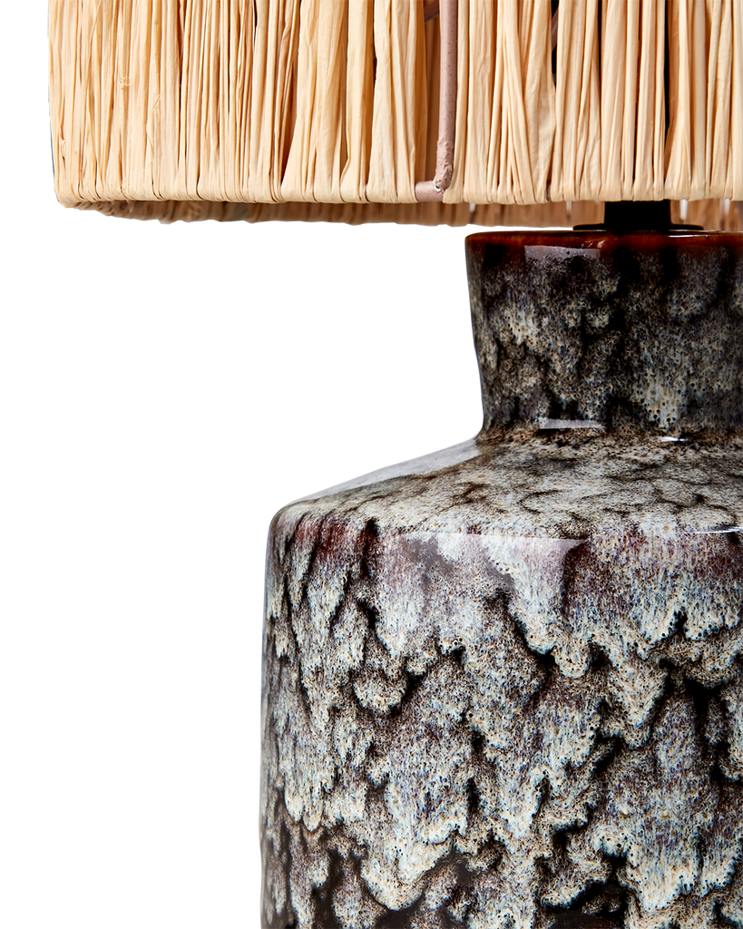 Elegant bordslampa i stengods med unik flerfärgad design och naturnära skärm för stilfull inredning.