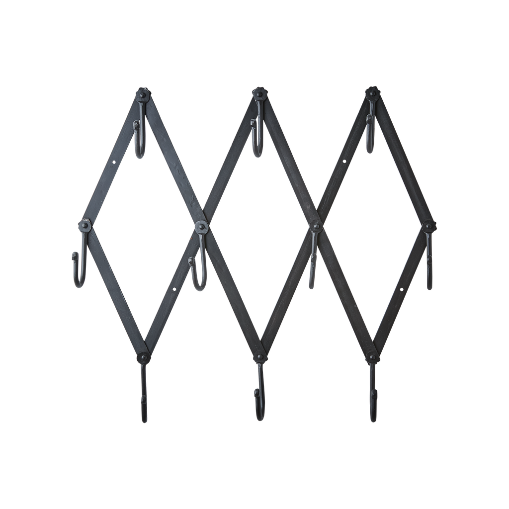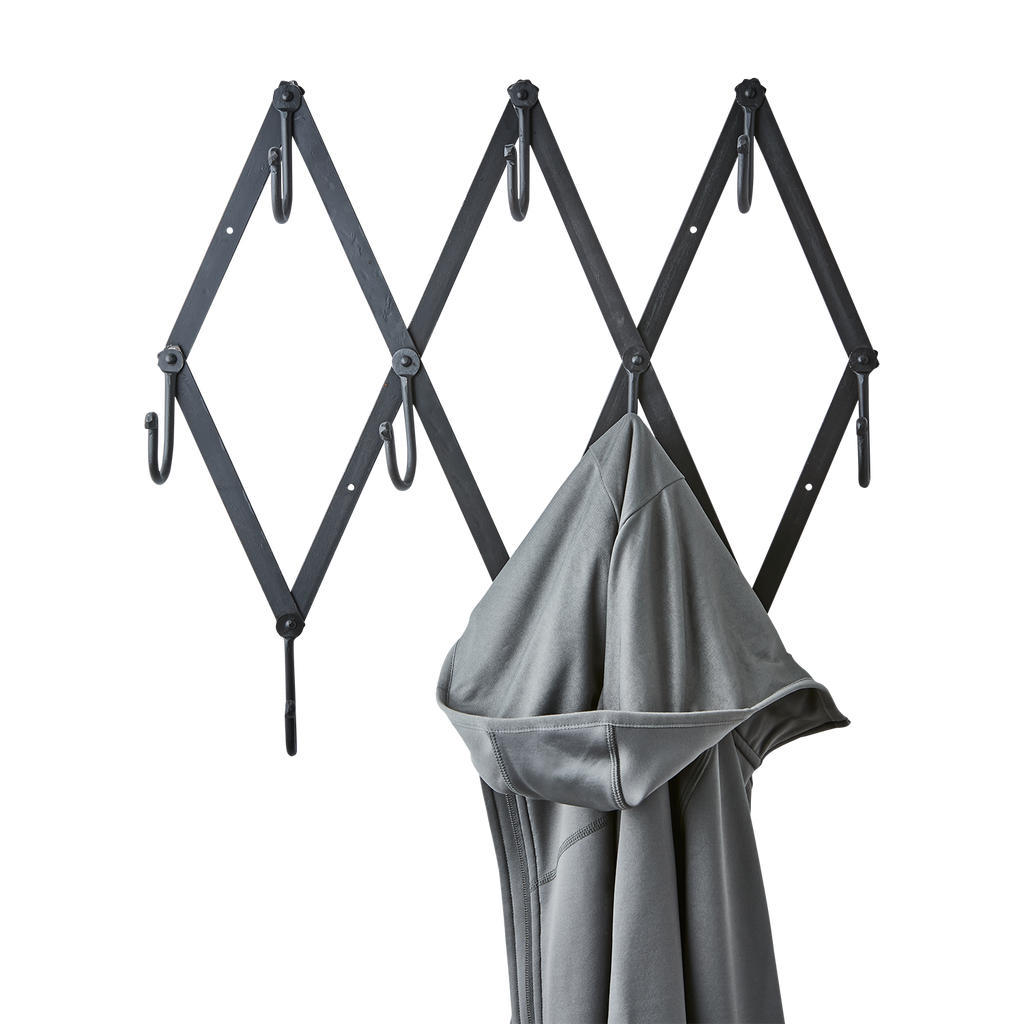 Den svarta färgen ger en tidlös känsla som passar in i alla inredningsstilar. Med sina unika triangulära mönster och starka krokar, erbjuder den både estetiskt tilltalande och praktisk förvaring för jackor, väskor och mer.