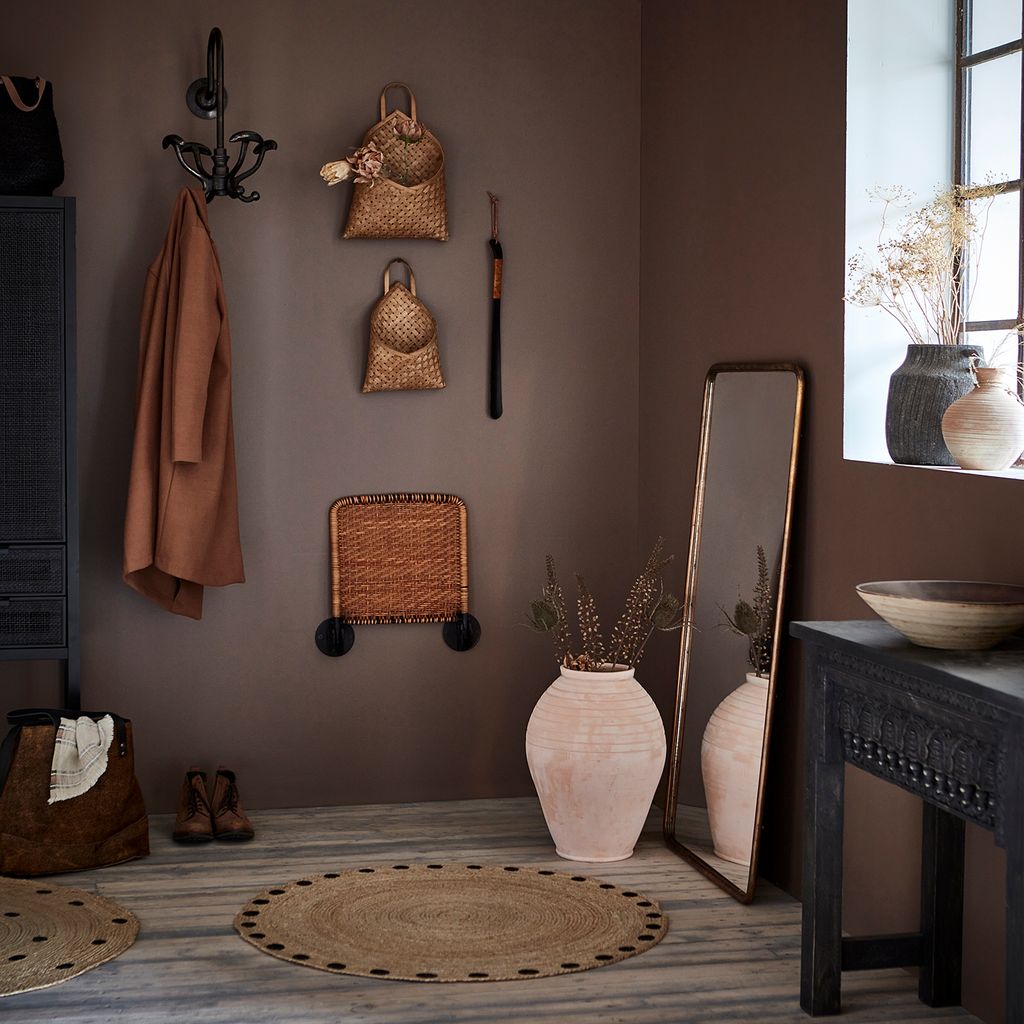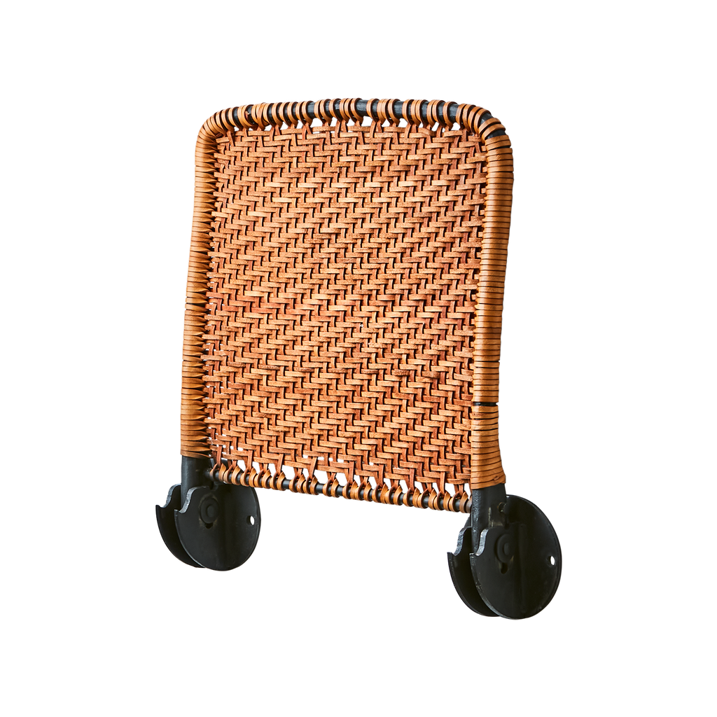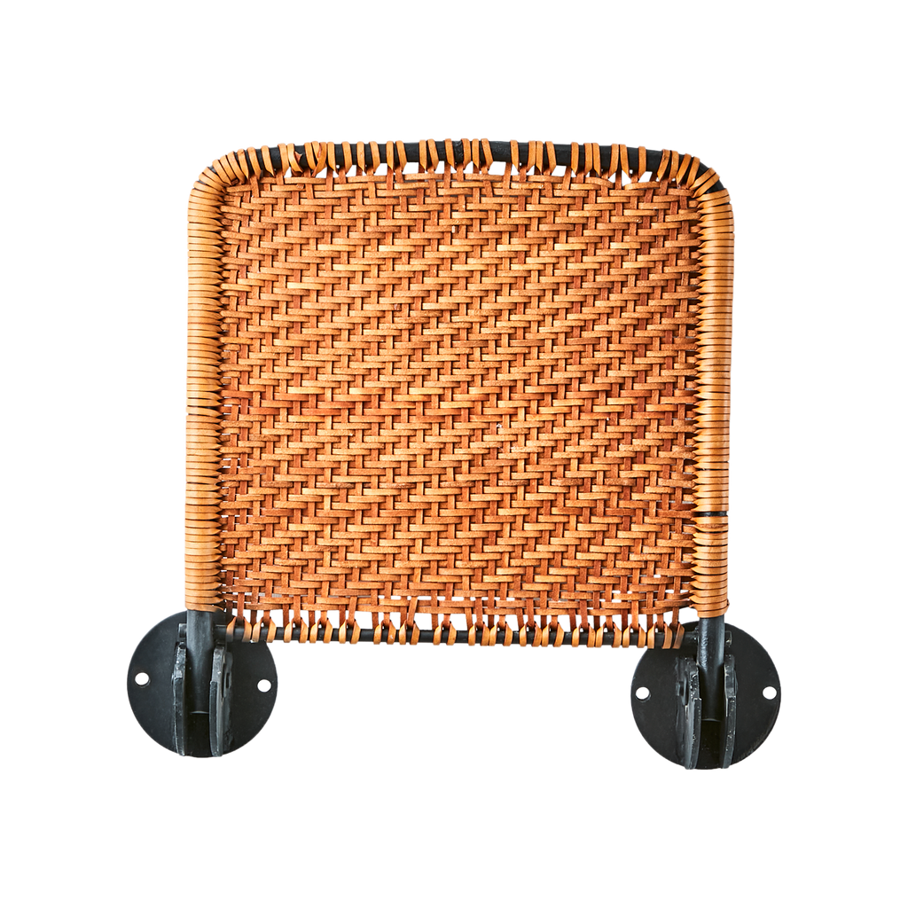 LOKE Väggstol är inte bara praktisk utan också en estetisk tillgång. Det flätade lädret i bruna toner kontrasterar vackert mot de svarta järndelarna, vilket skapar en sofistikerad och inbjudande atmosfär.