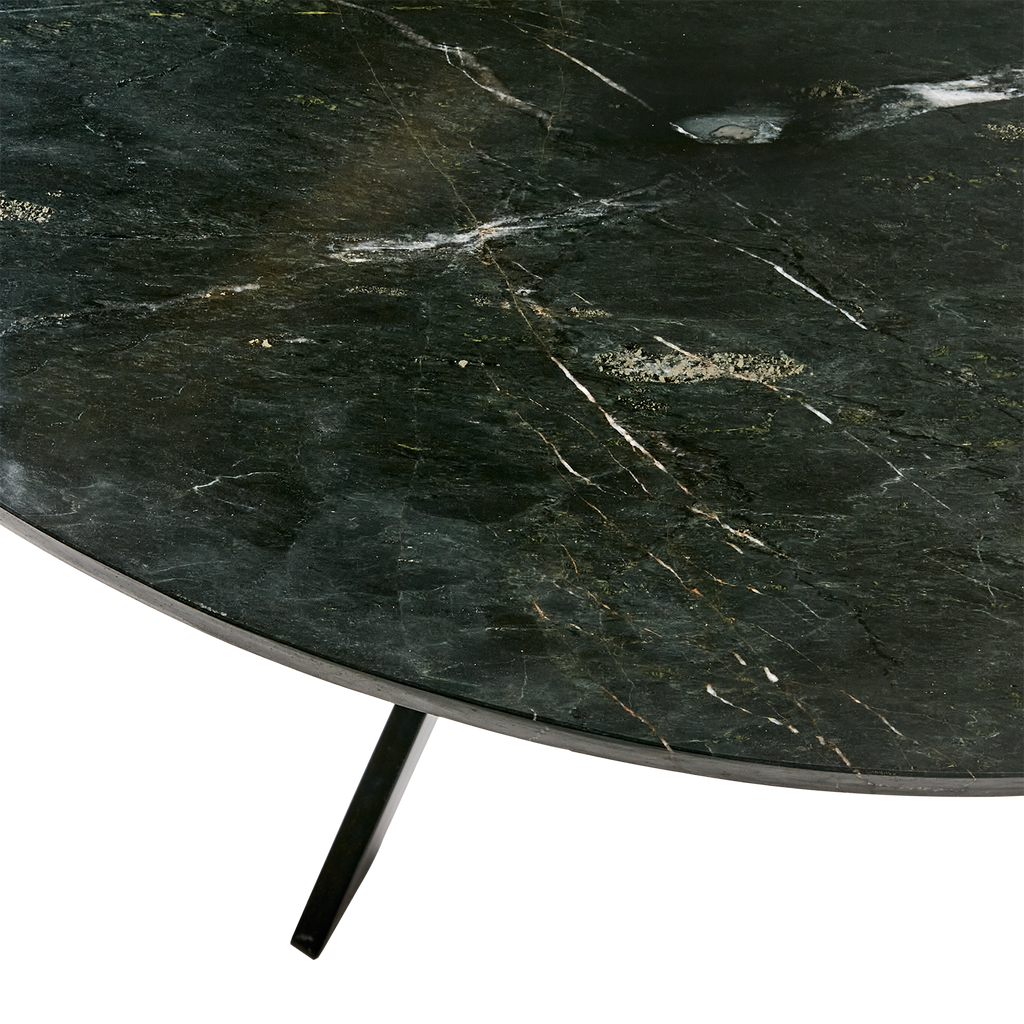 - Den rundade bordsskivan är tillverkad av svart marmor med subtila vita ådringar som ger en sofistikerad känsla.