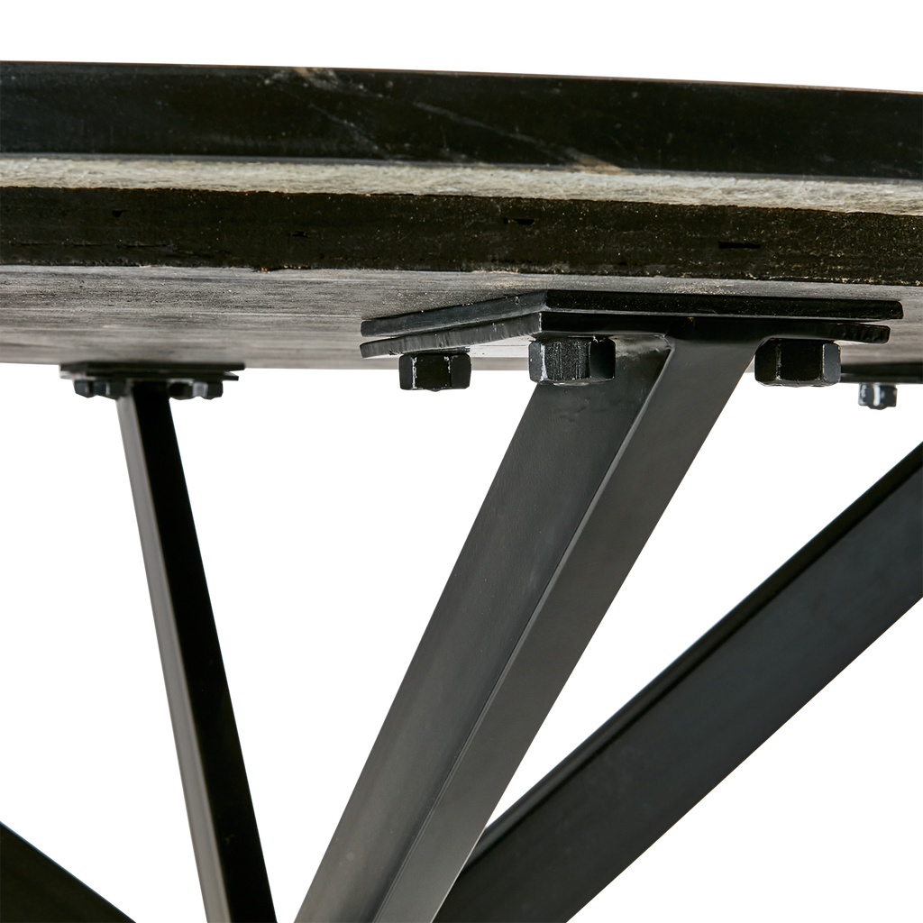 - De robusta benen är gjorda av hållbart järn, designade i ett korsande mönster för optimal stabilitet och modern estetik.