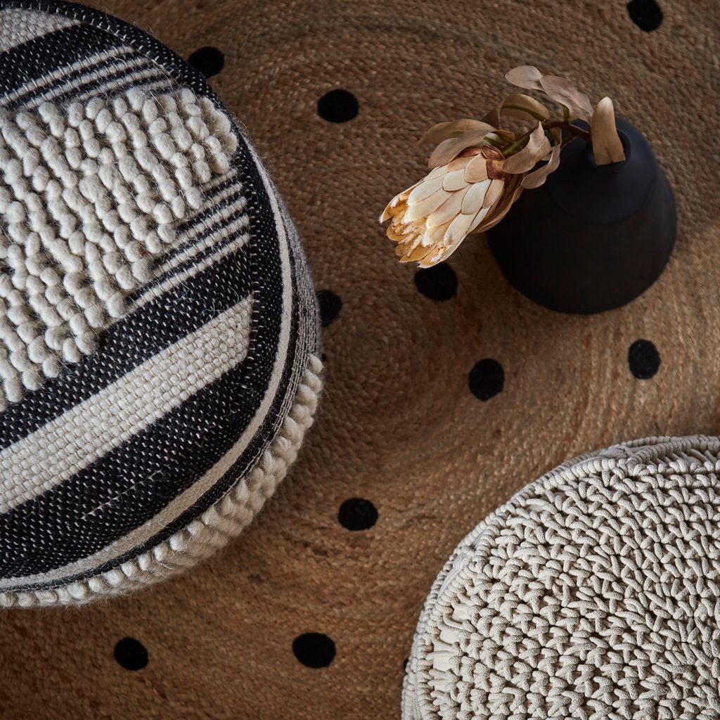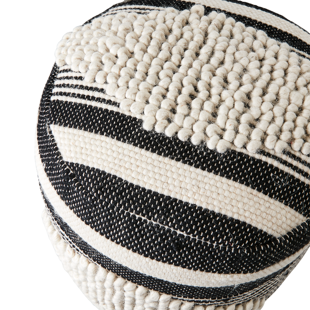 Elegant sittpuff i svart och elfenben från MINNA-kollektionen, tillverkad av ull och bomull för stil och komfort.