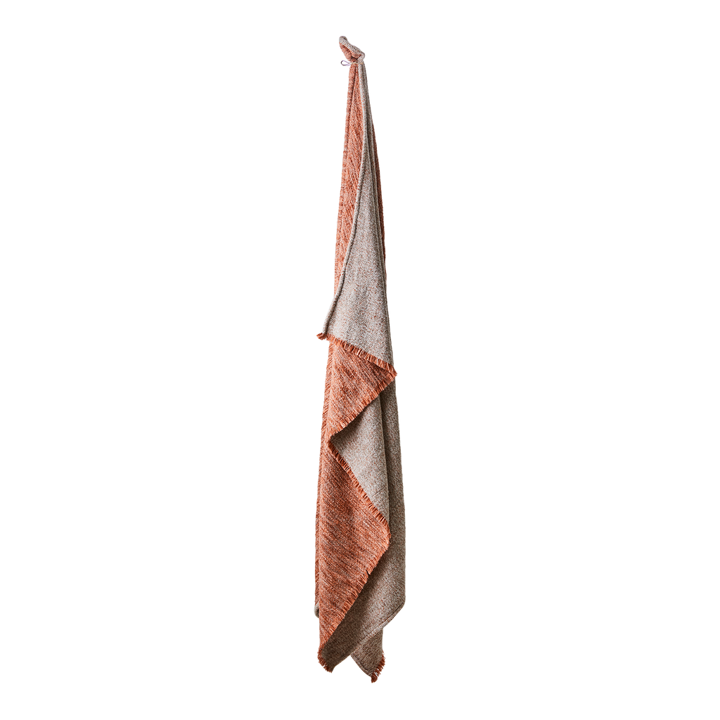 Elegant och mjuk filt i polycotton med vackra beige och korallfärger, perfekt för alla rum.