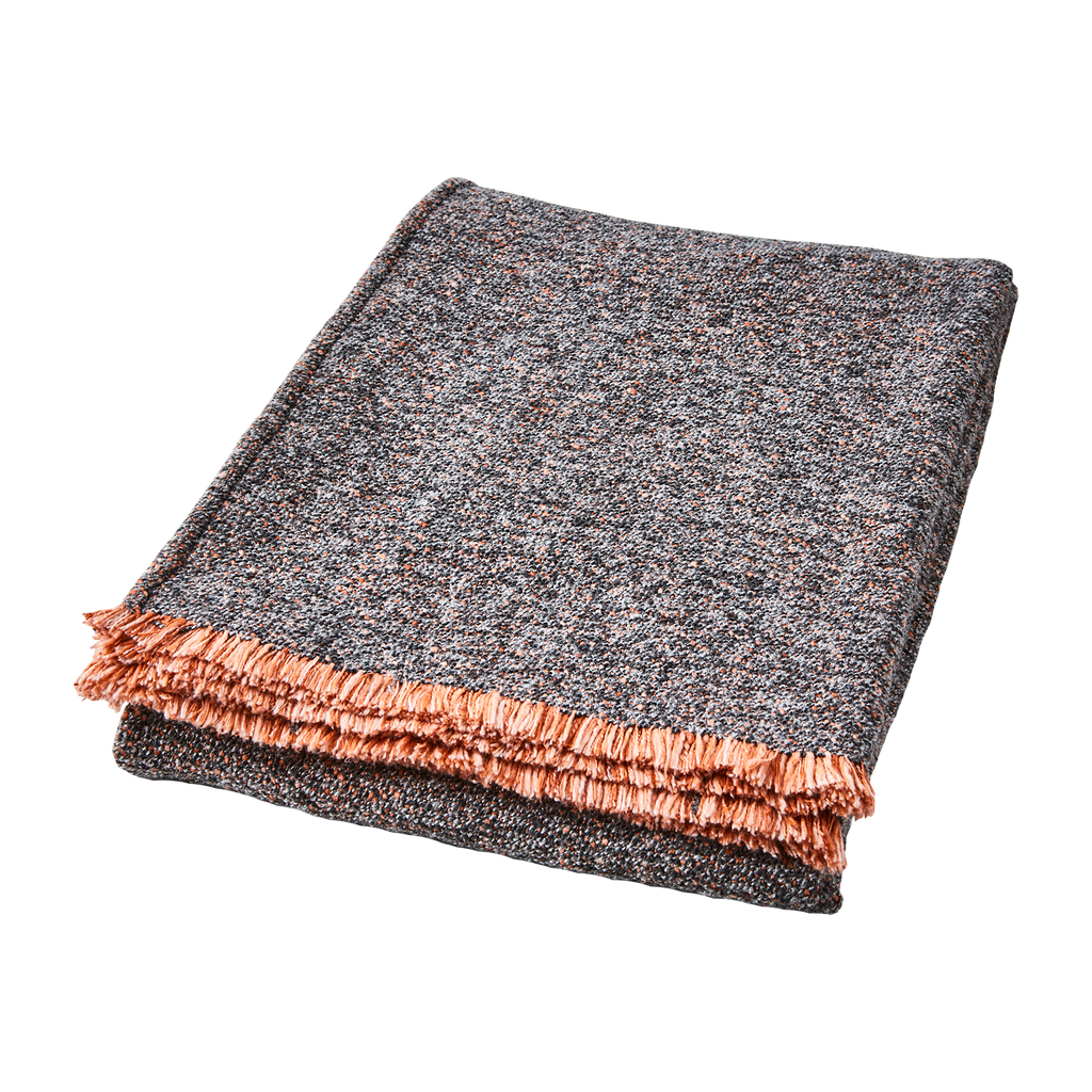 Elegant filt i grå och korall, tillverkad av polycotton för en mjuk och hållbar känsla, perfekt för svala kvällar.