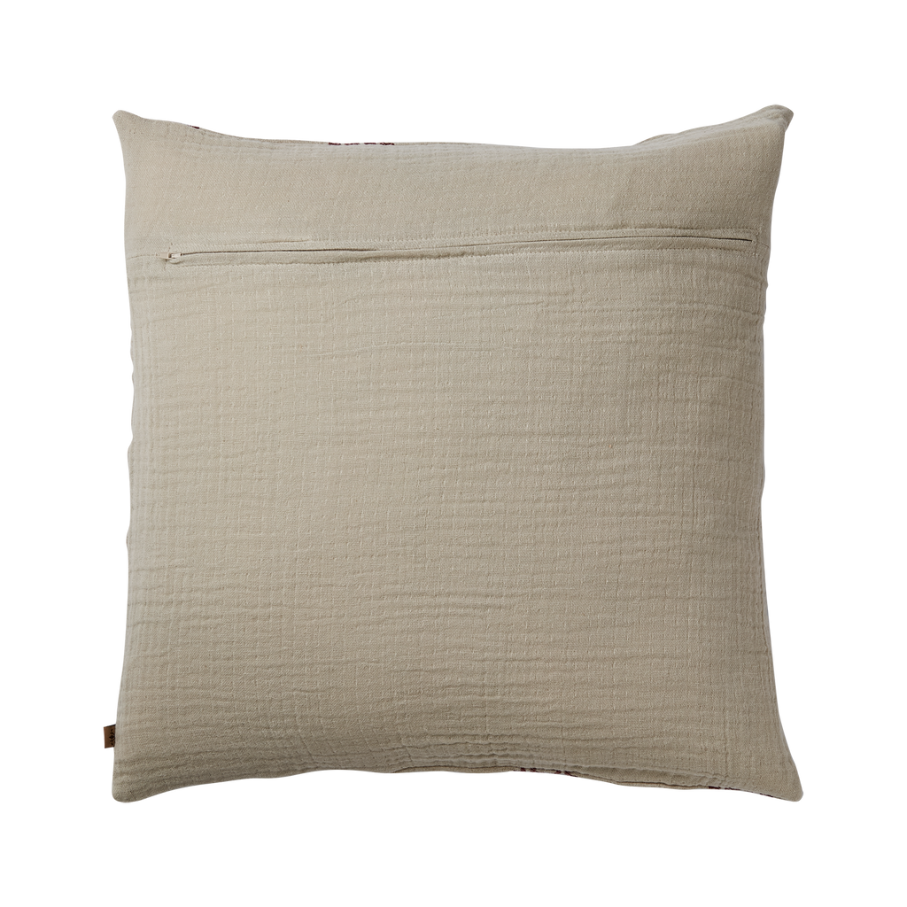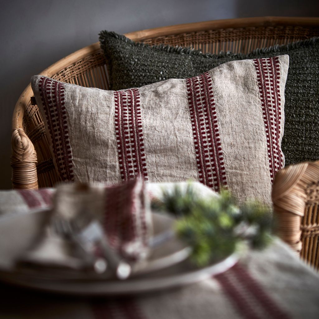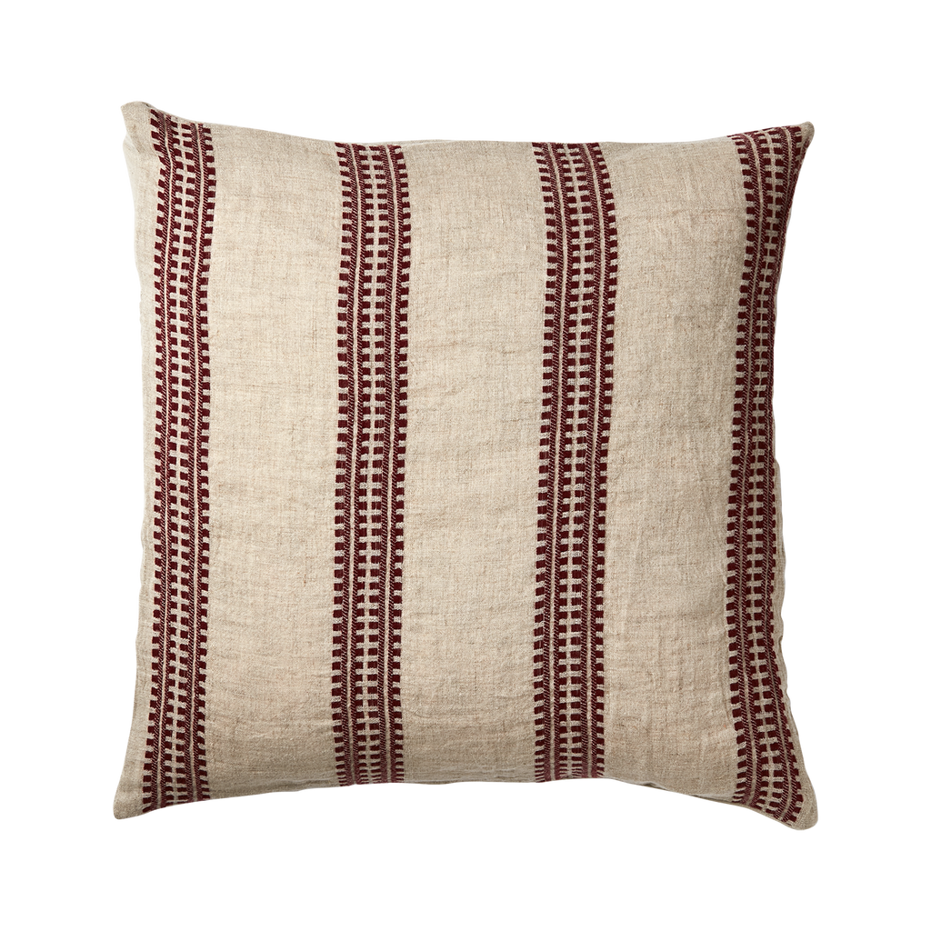 Stilrent kuddfodral i bomull och linne med röd/naturmönster. Perfekt för att ge värme och stil till ditt hem.