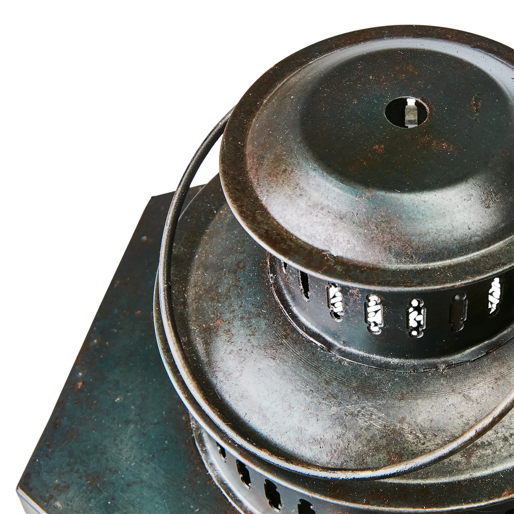 Elegant lykta i järn med detaljerat mönster, patineras vackert över tid.