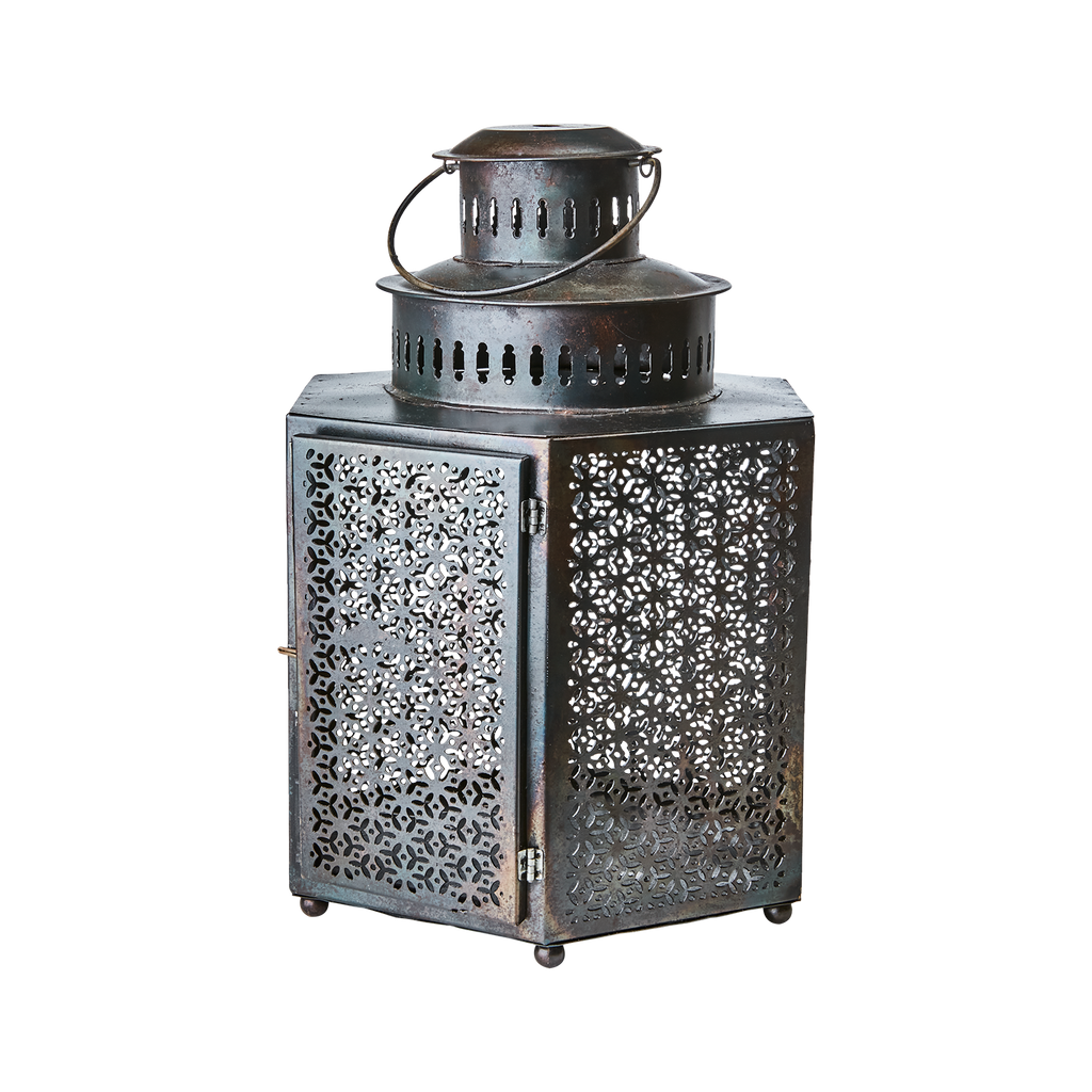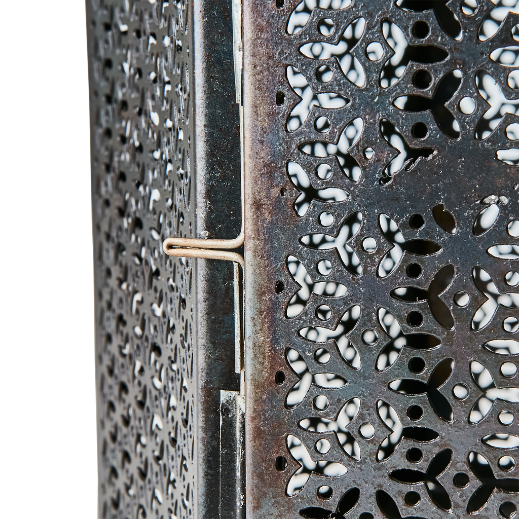 Den detaljerade utskärningen i metallen ger ett fascinerande ljusmönster som accentuerar alla rum. Dess robusta design gör den idealisk för både inomhus- och utomhusbruk. Den perforerade toppen tillåter optimal spridning av ljuset, medan handtaget gör den lätt att flytta.