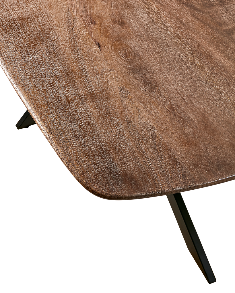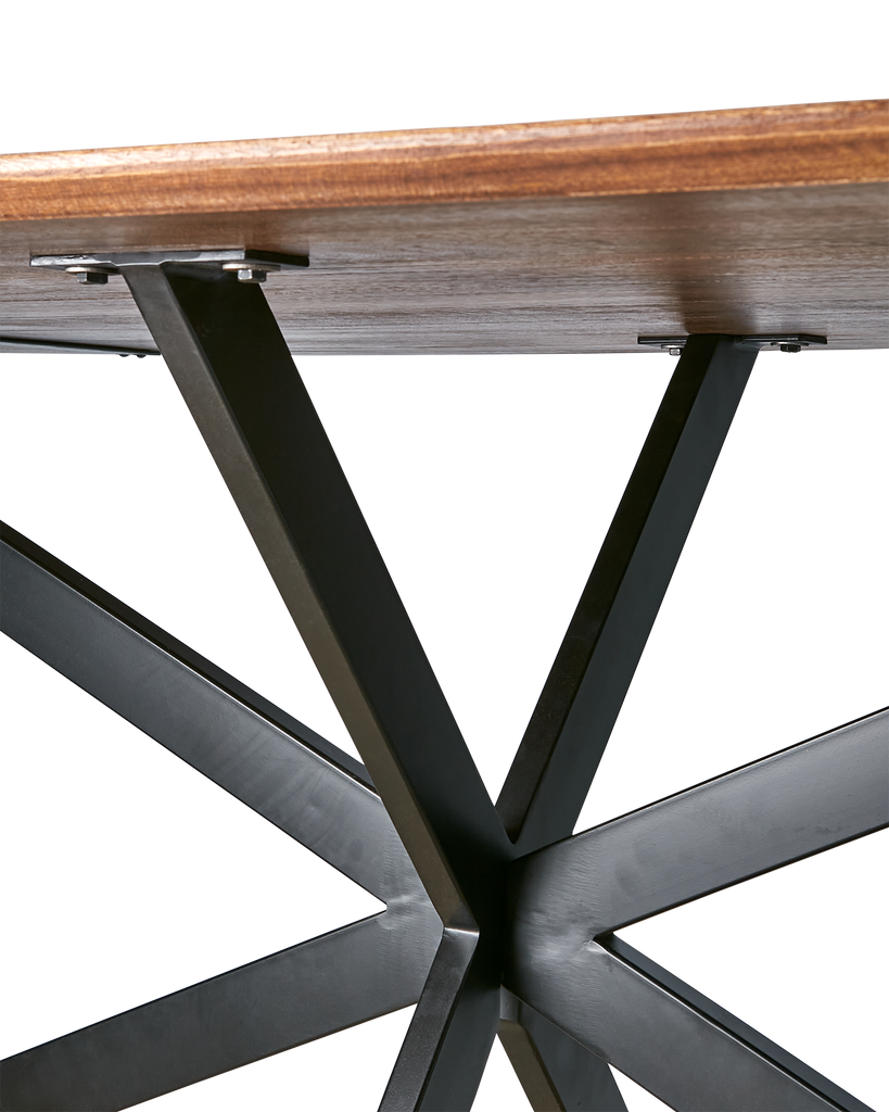 Den unika stjärnformade metallbasen tillför en modern touche och stabilitet, vilket gör det idealiskt för både vardagsbruk och speciella tillfällen. Bordsskivan har en mjuk finish och naturliga träådringar som framhäver dess genuinitet och charm.