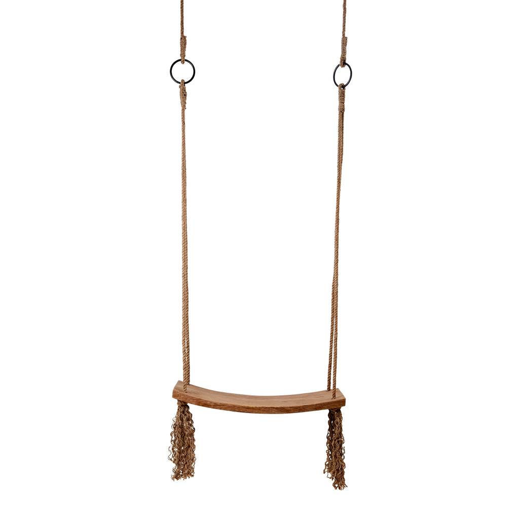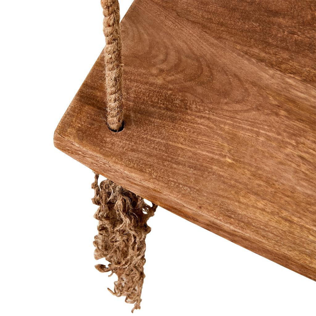 Elegant gunga i ljusbrun mangoträ med hållbara juterep och robust järnring för säker upphängning.