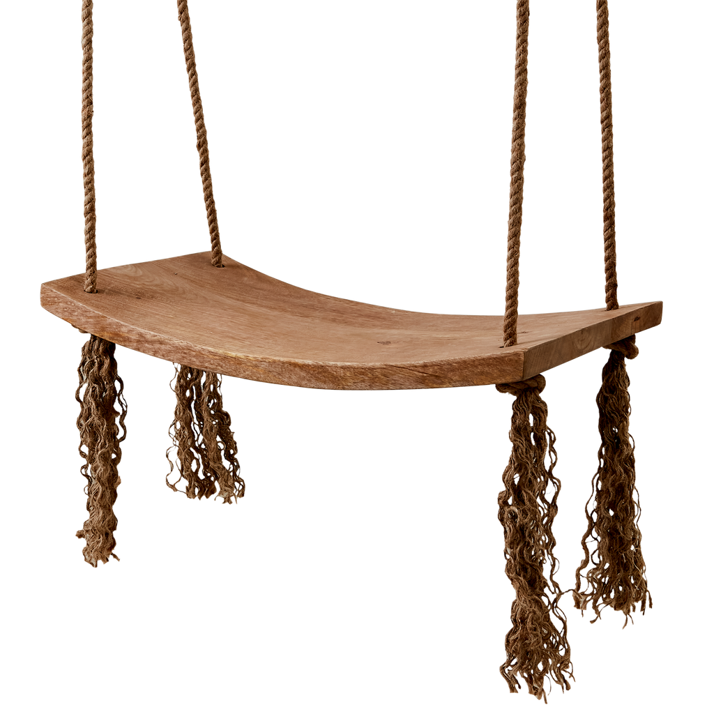 Upptäck en elegant och robust gunga från Affari of Sweden, perfekt för att skapa en rofylld plats i din trädgård eller på verandan. Den ljusbruna nyansen på mangoträet ger en naturlig och varm känsla, medan de slitstarka juterepen bidrar till både estetik och hållbarhet.