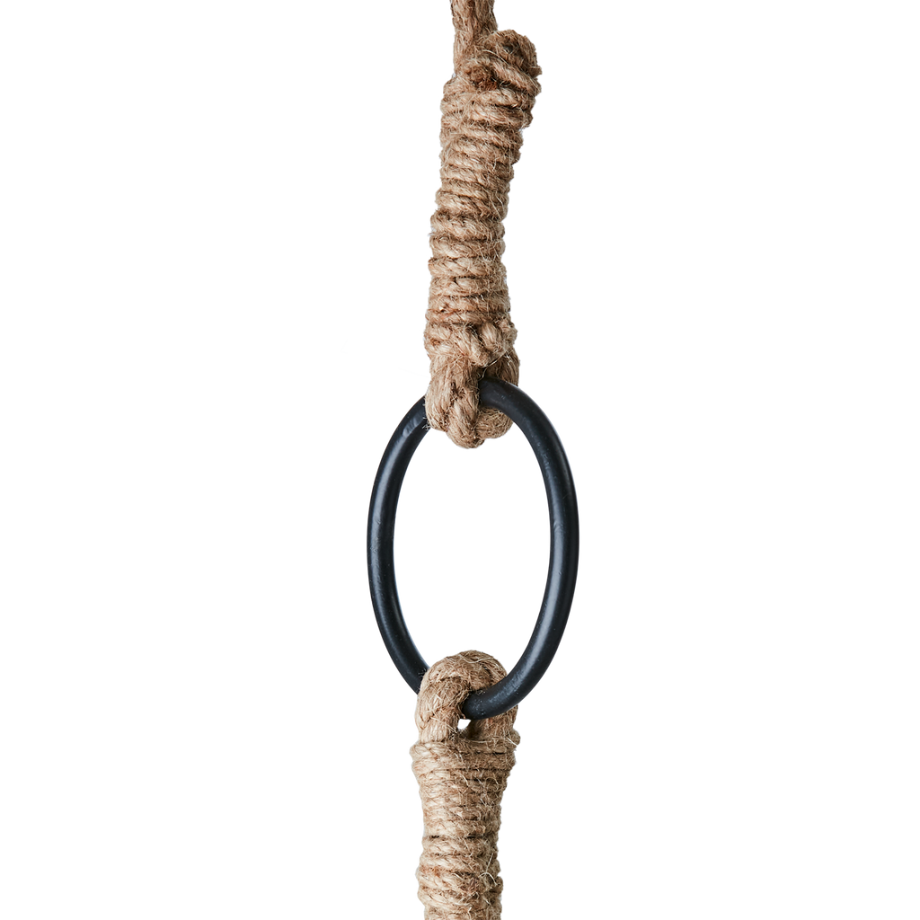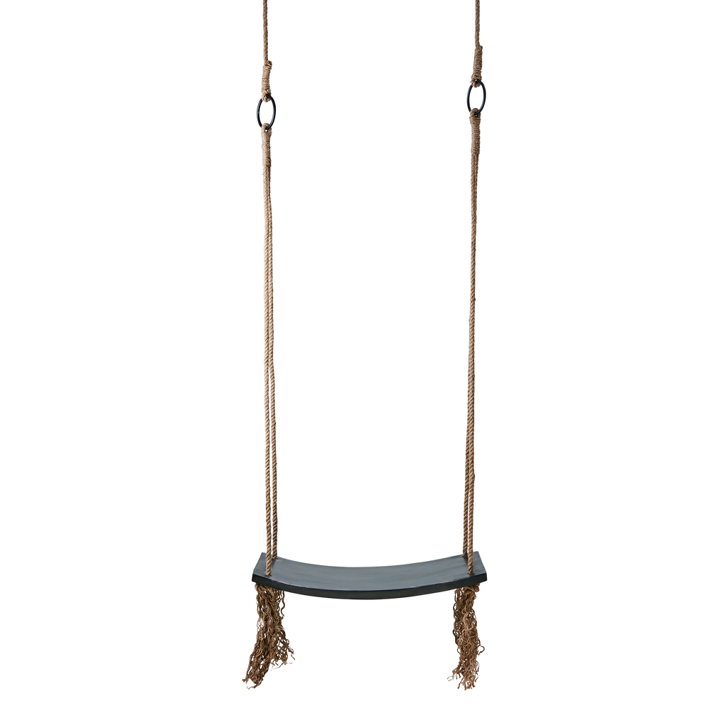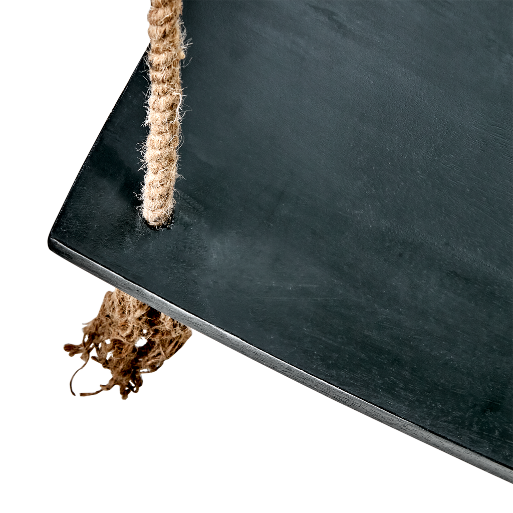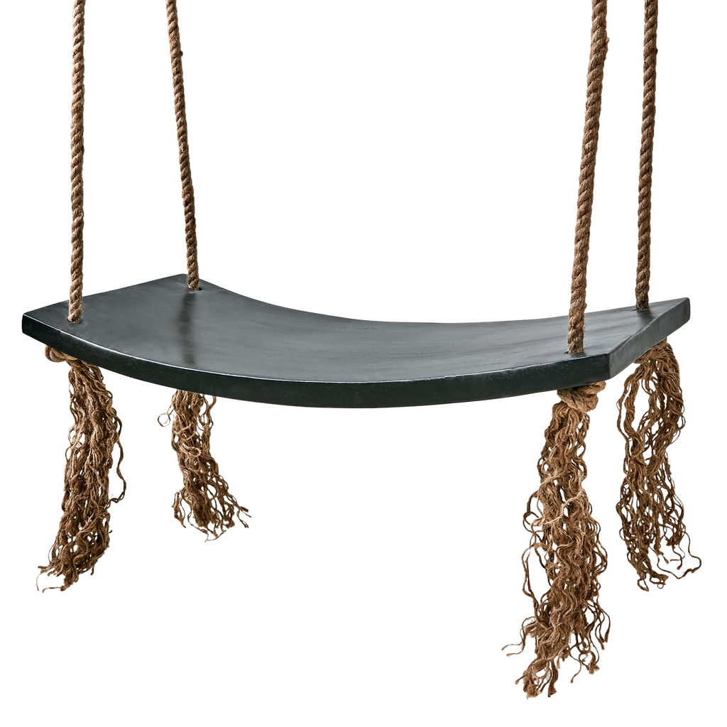 Elegant svart gunga i mangoträ med slitstarka jutesnören och järndetaljer för en stilren och robust upplevelse.