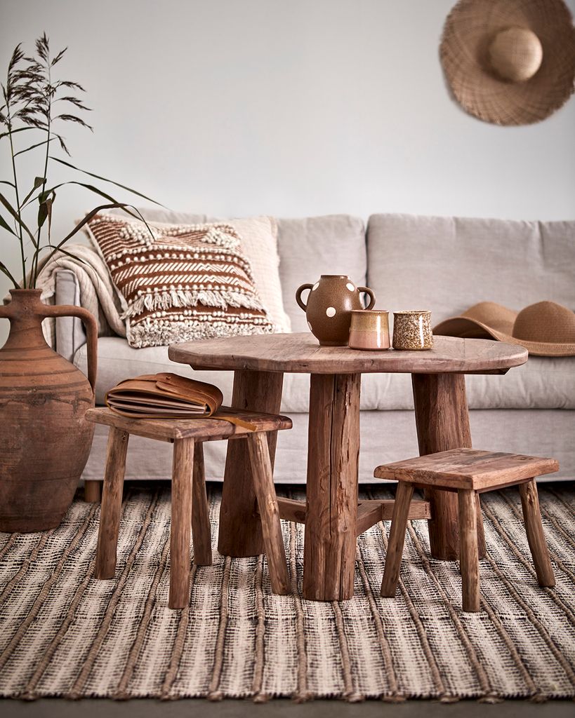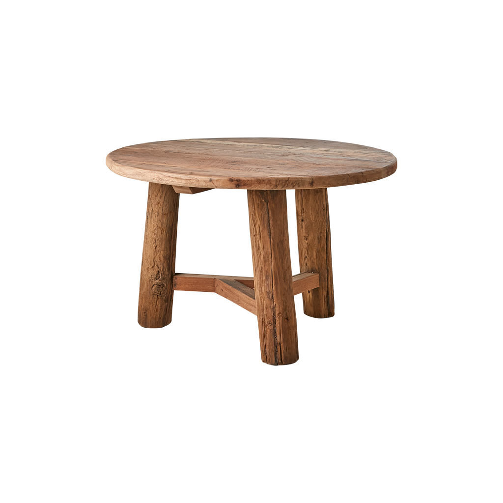 Den runda bordsskivan och de robusta benen skapar en harmonisk och stabil möbel som passar perfekt i både moderna och traditionella hem. Den naturliga träfärgen smälter in i många olika inredningsstilar och bidrar till en varm och inbjudande atmosfär.