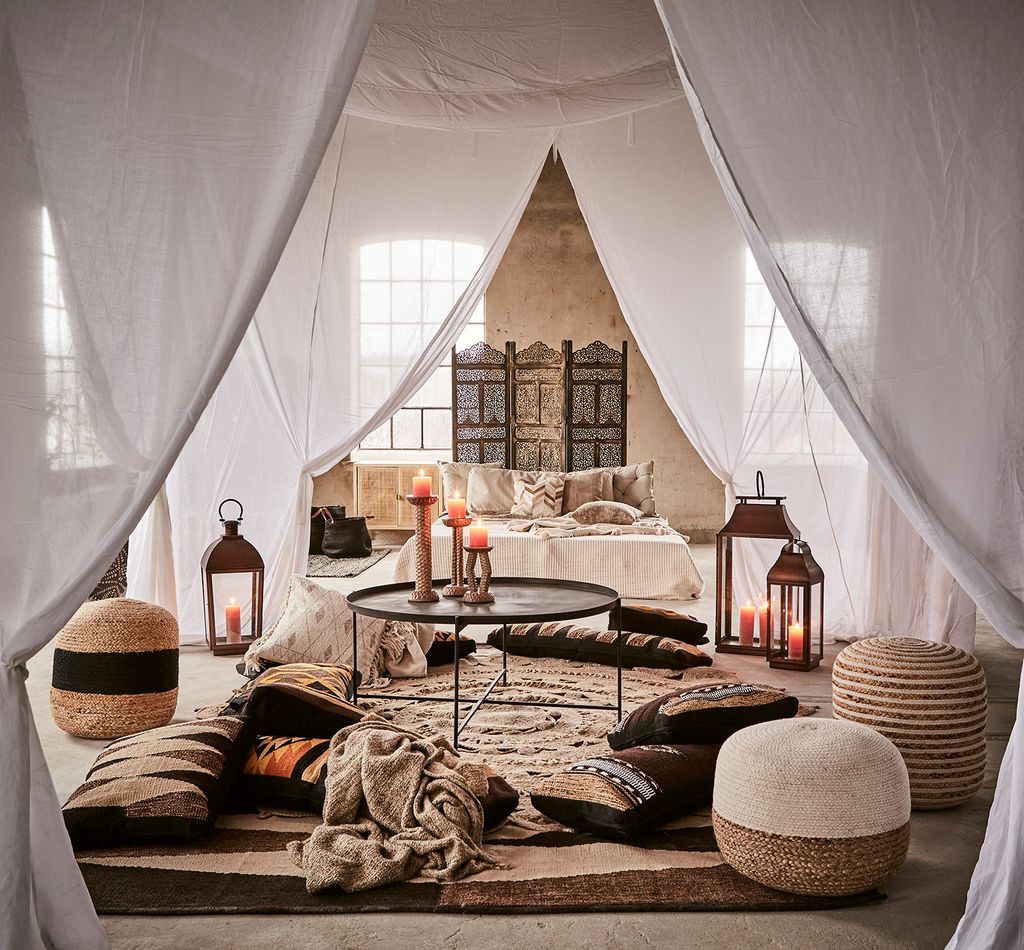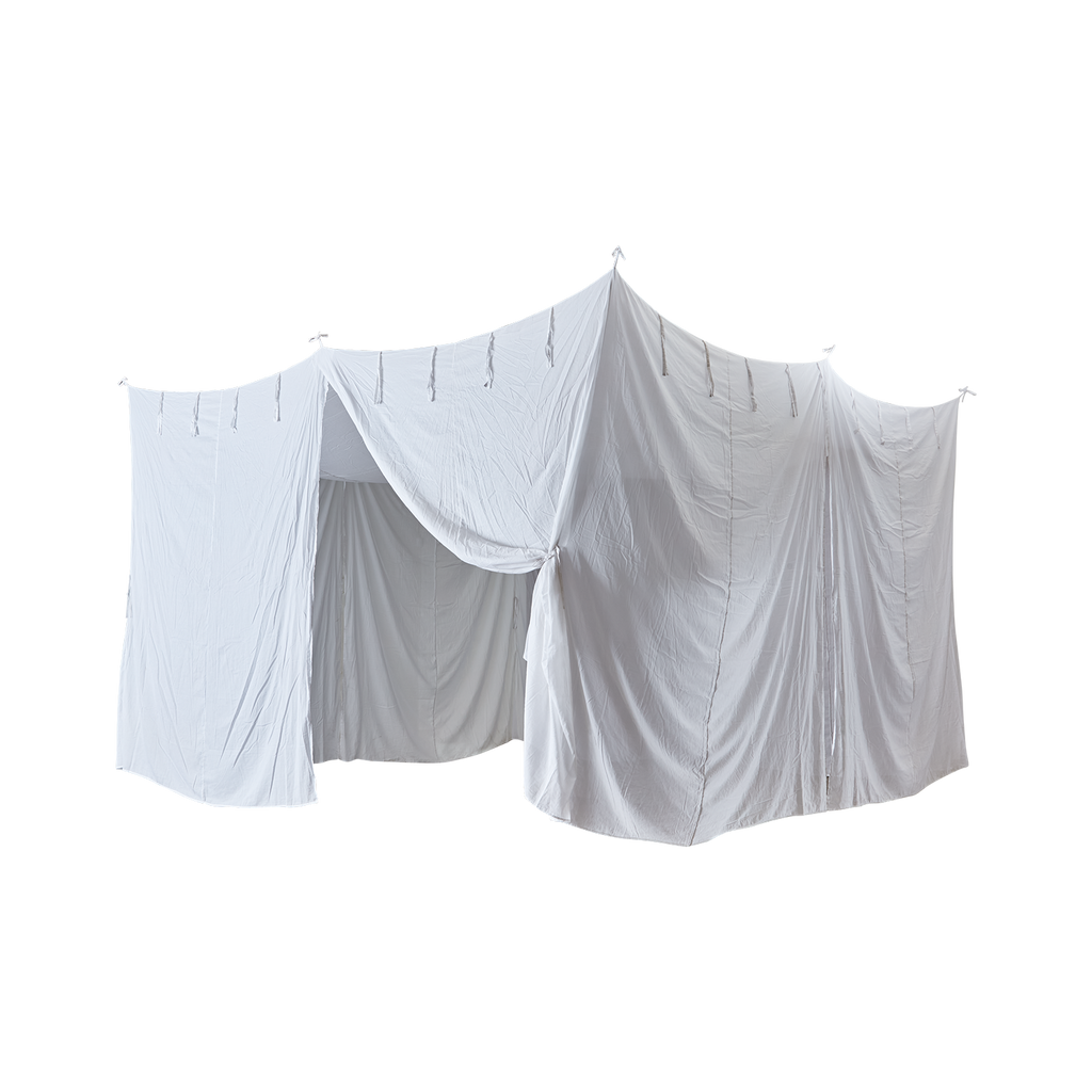 Elegant vit sänghimmel i bomull från SHIBA-kollektionen, skapar en mjuk och avkopplande atmosfär i sovrummet.