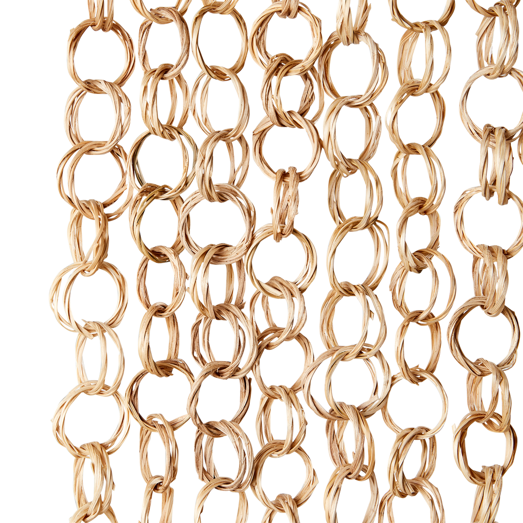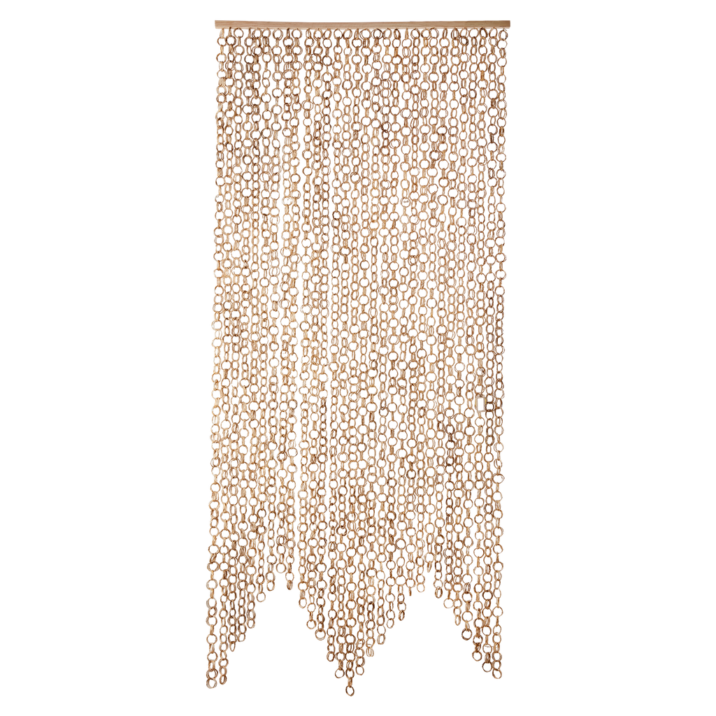 Gardinen har en härlig, naturlig färgton som passar perfekt in i moderna som traditionella inredningar. Dess unika design av sammanlänkade bamburingar skapar en vacker textur och rörelse, vilket gör den till ett konstverk i sig.