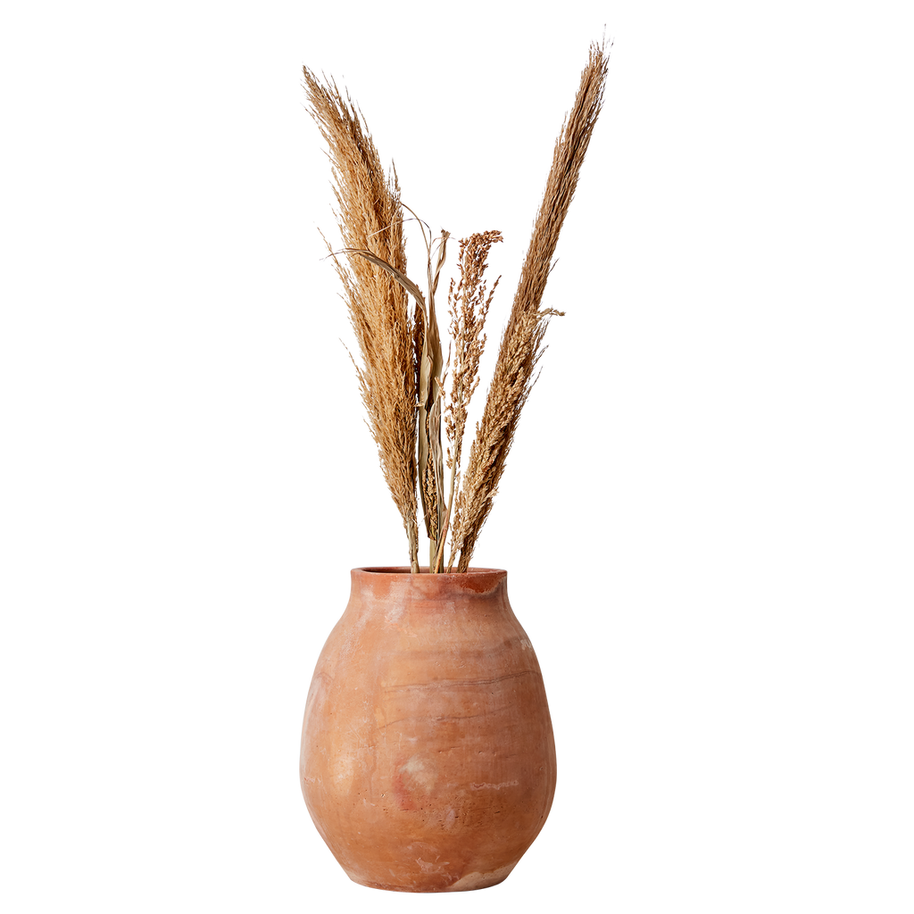 Perfekt för att förhöja inredningen i alla rum, från rustika till moderna hem. Dess generösa dimensioner (~Ø18/28xH36) gör den idealisk för större arrangemang av torkade blommor eller kvistar. Kom ihåg att använda vattentäta fat för att undvika fläckar.