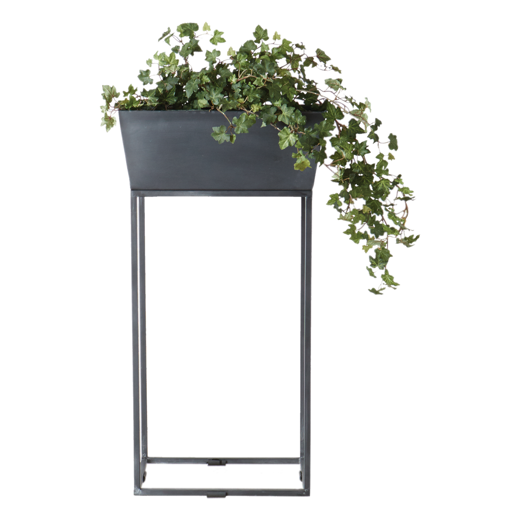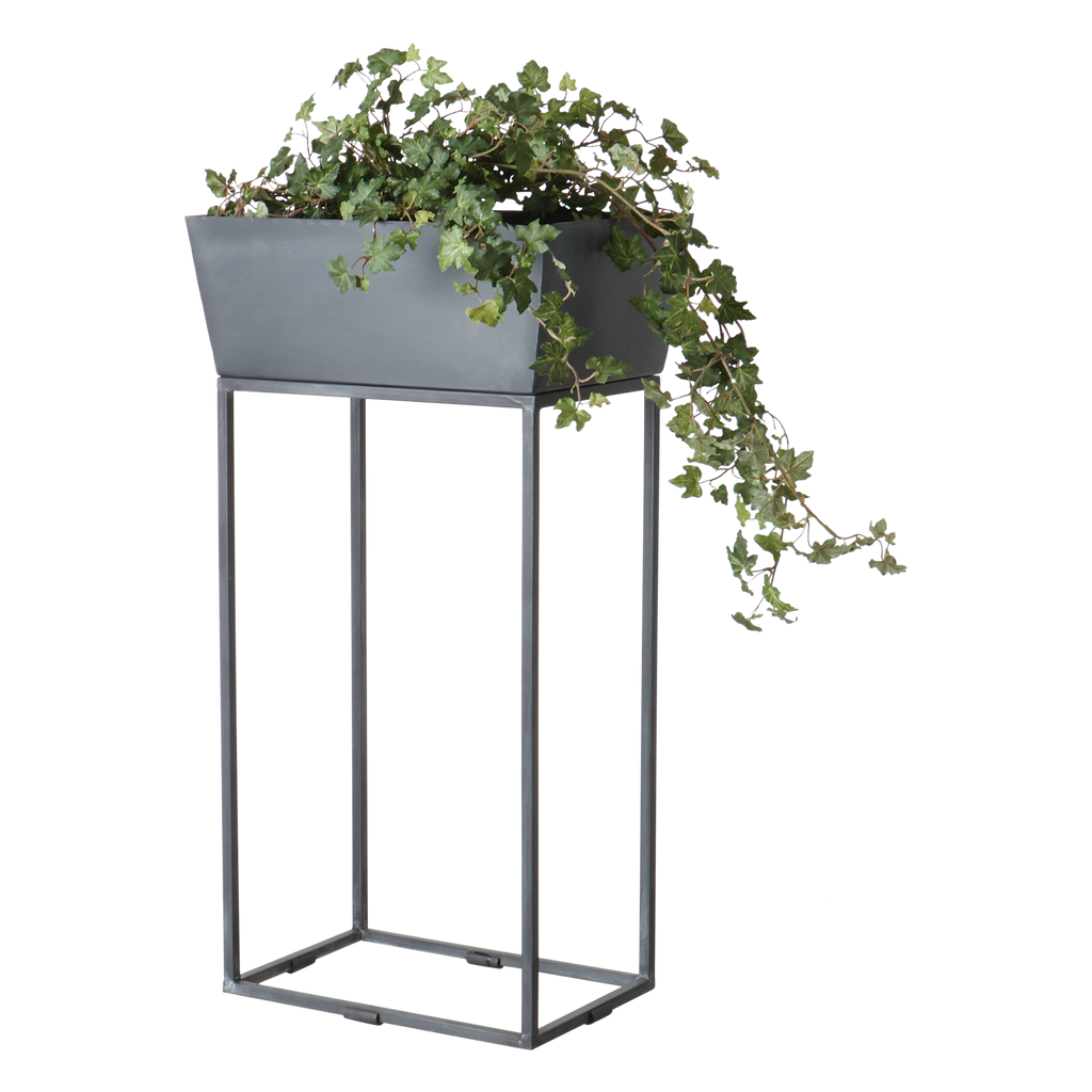 Elegant grå kruka i järn på stativ, perfekt för både inomhus och utomhusbruk med naturlig patina över tid.