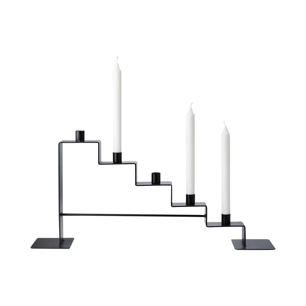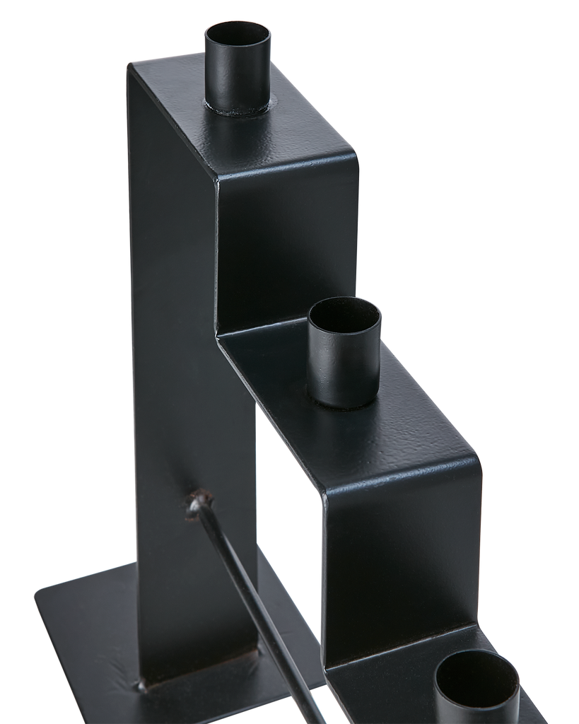 Ljusstaken har en unik, geometrisk design med en trappstegsformad struktur, vilket gör den till en iögonfallande del i varje rum. Dess mattsvarta finish ger en modern och elegant look, perfekt för både vardagsrum och middagsbord.