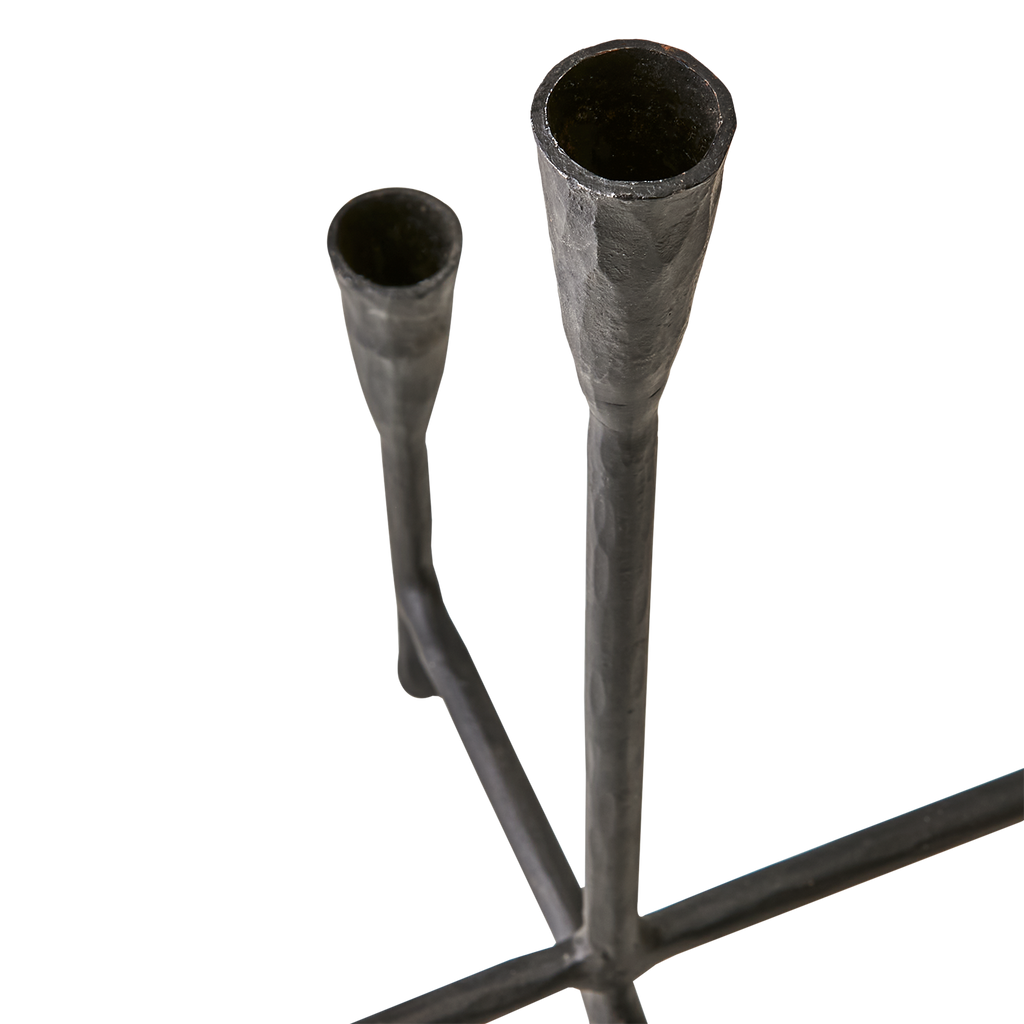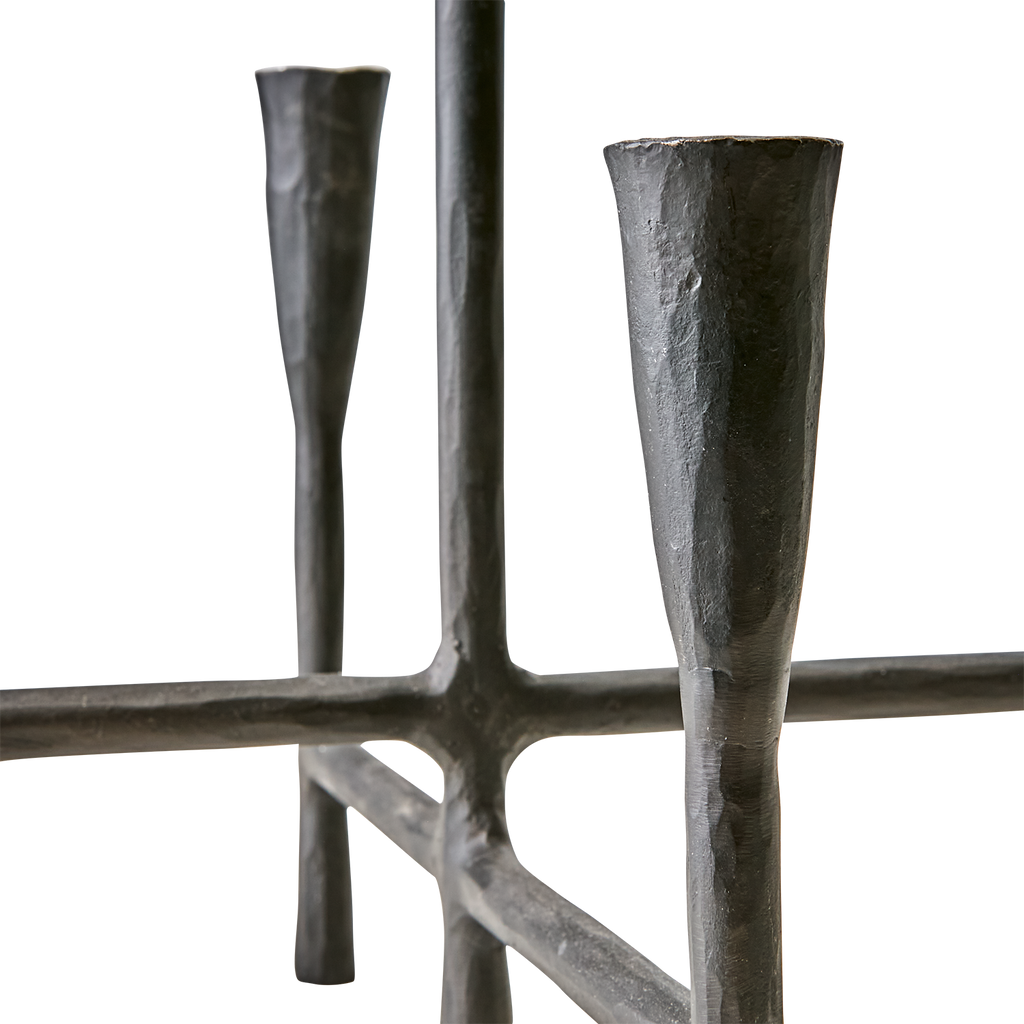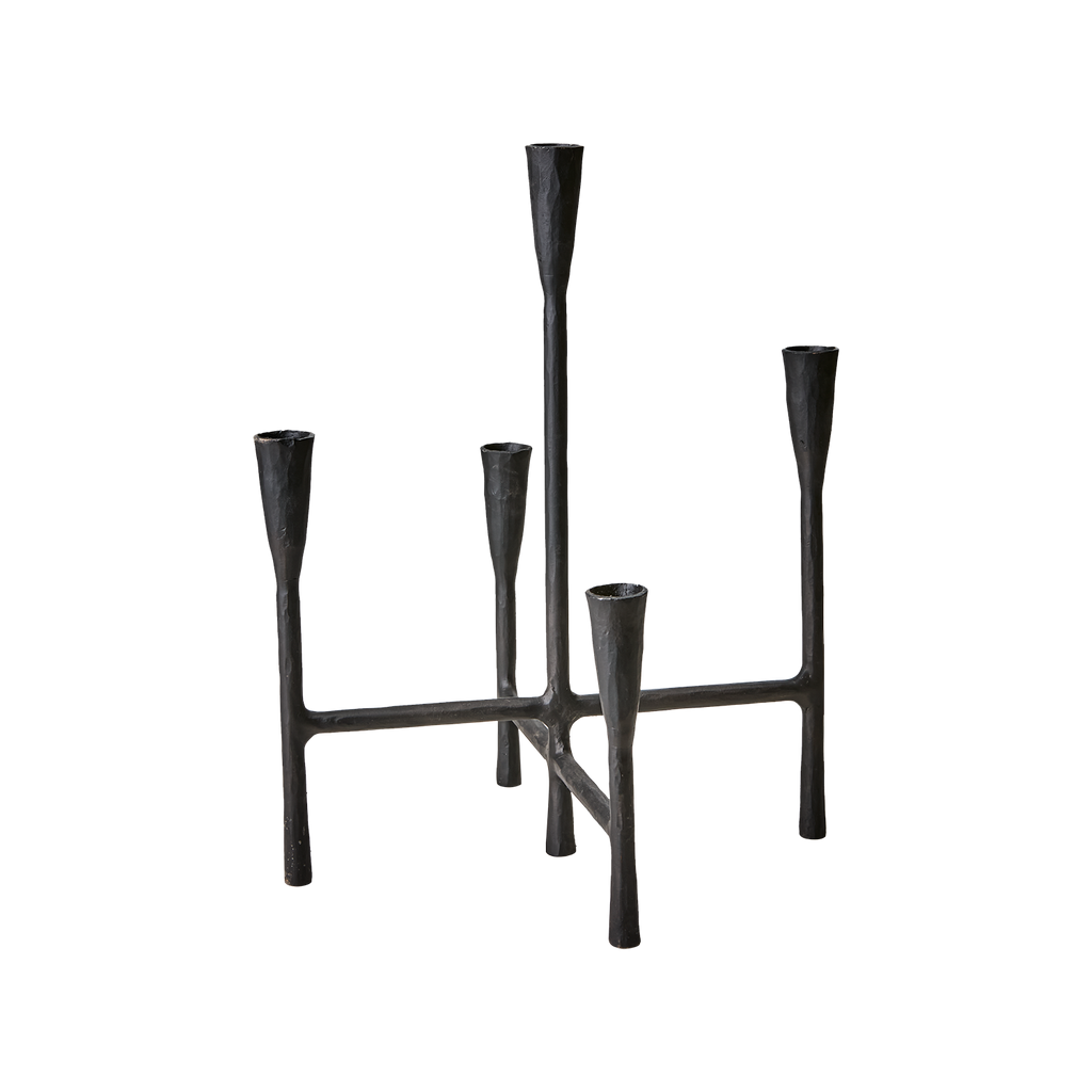 Elegant svart kandelaber i järn som kombinerar traditionell design med modern stil. Perfekt för stämningsfulla middagar.