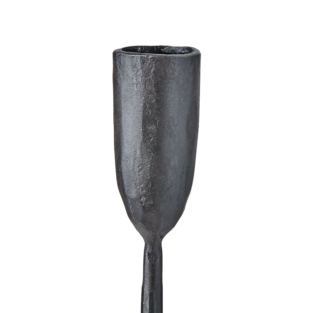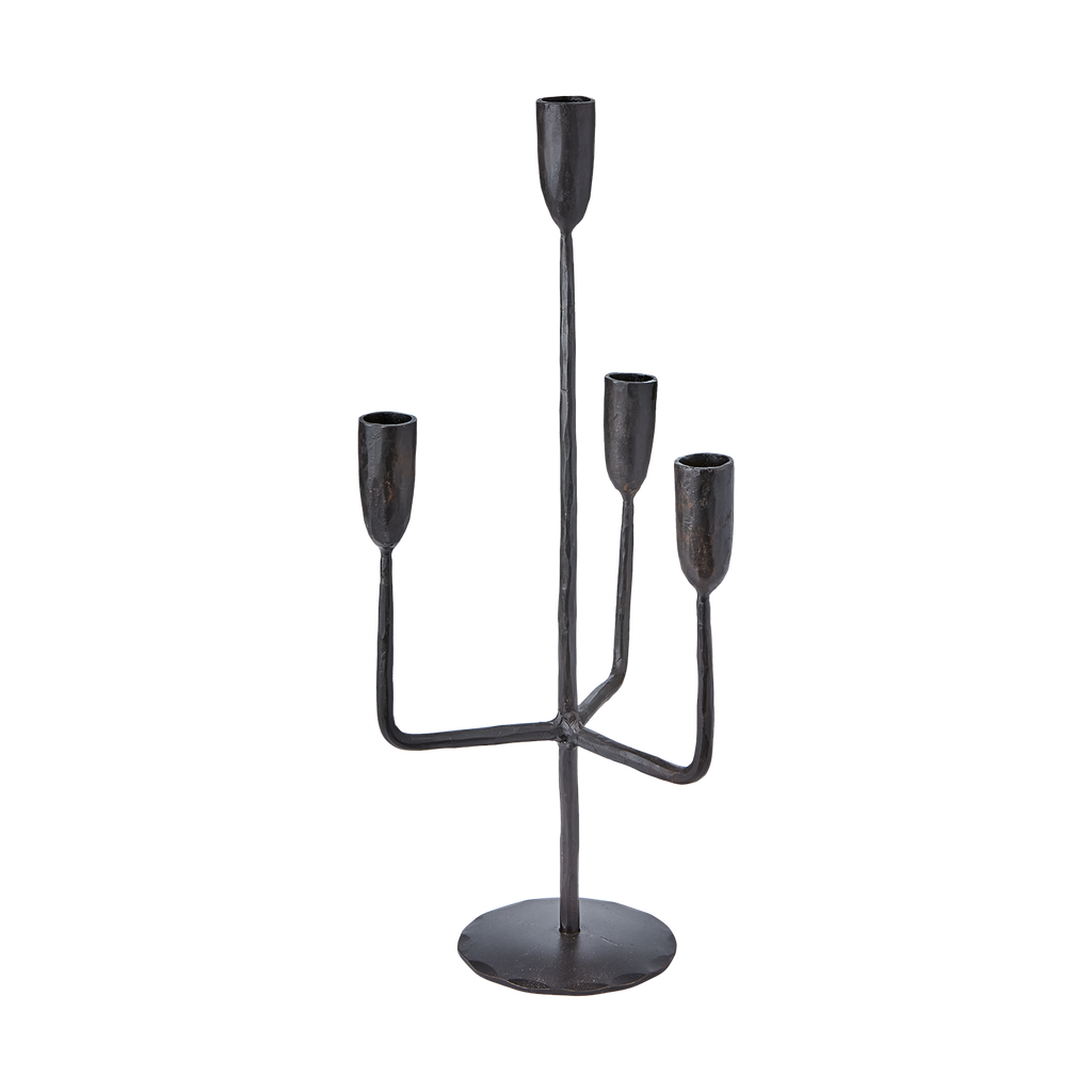 Elegant svart kandelaber i järn, perfekt för att skapa stämningsfull belysning i hemmet.