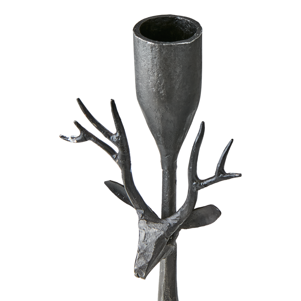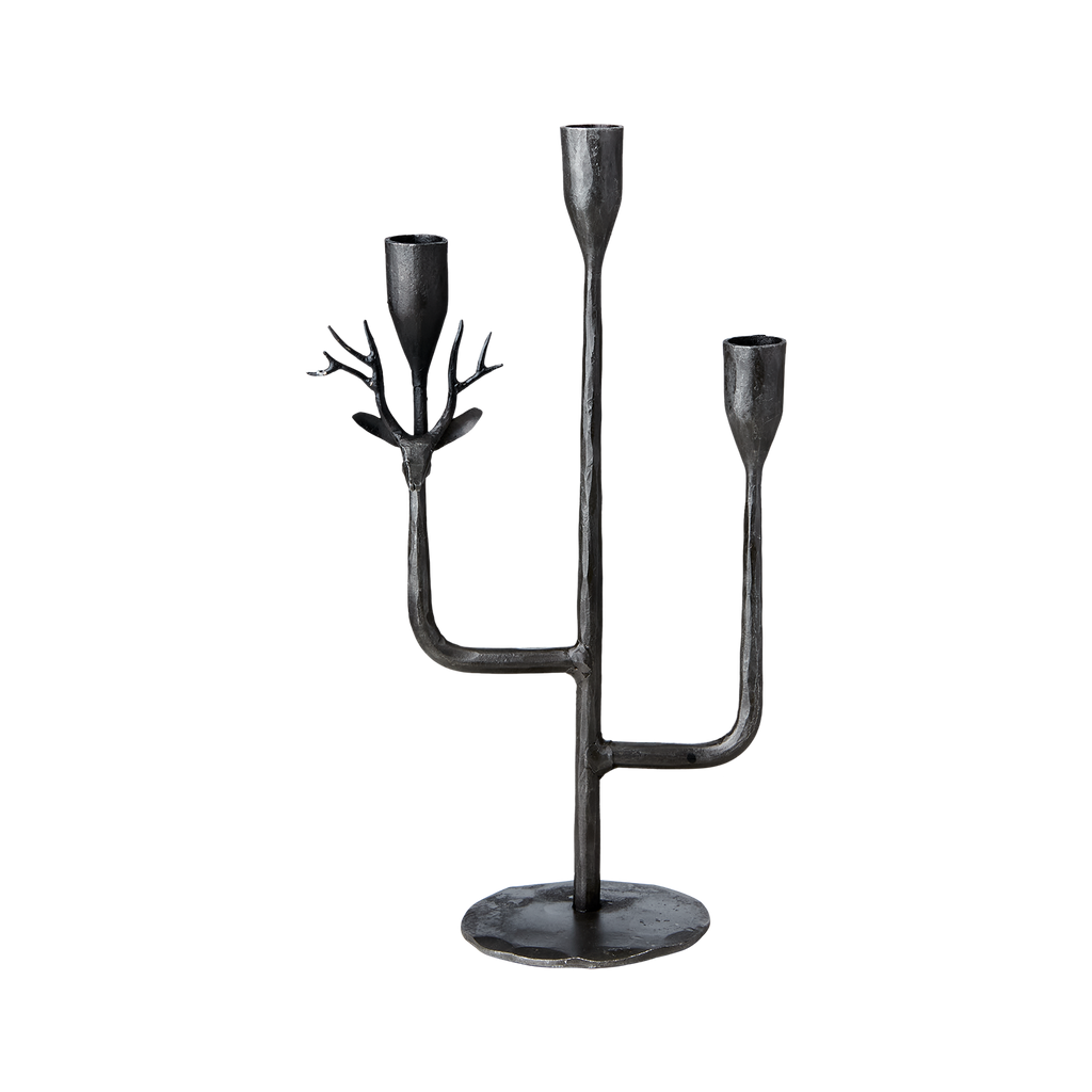 Elegant svart ljusstake i järn med unik design av hjorthorn, perfekt för stämningsfull belysning.